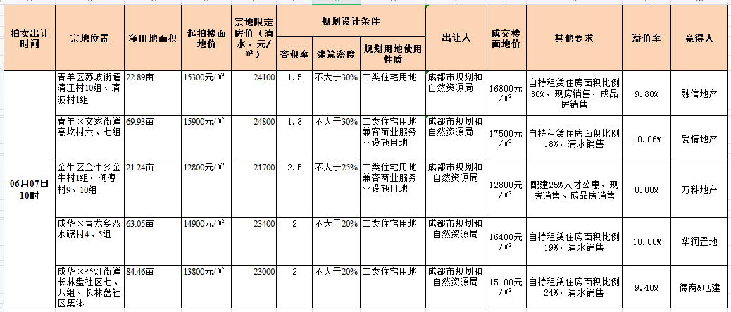 其中,溢价率最高的为青羊区文家街道70亩地块,溢价率10.06%,自持租住房面积比例18%,由来自保定的爱情地产拿下,这也是爱情地产在去年高调拿地龙泉驿地块后的再次亮相。