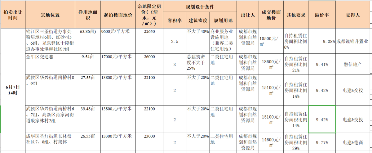 从成交结果来看,上午拿下青羊区苏坡街道22亩地块的融信再次出手拿下金牛区交通巷9.5亩最小地块,成都锐锦升置业以溢价率9.38%,拿下锦江区三圣乡地块;电建联合交投以溢价率9.42%,自持租赁住房面积比例14%拿下武侯区华兴街道两宗土地;最终电建又联手德商地产举牌数轮,以溢价率9.7%,自持租赁住房面积比例29%将今天拍卖的最后一宗地——成华区圣灯街道26.5亩地块收入囊中。