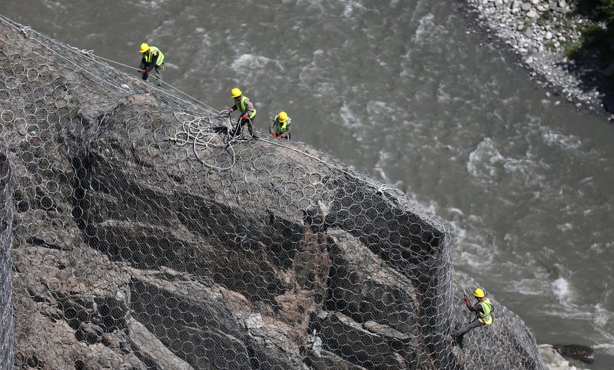 比如,修建施工区域顶部的被动防护网用于拦截上部斜坡的滚石;开挖底部截水沟用于引导河谷流水排出作业面;定向坡面爆破用于清理坡面危岩;安装预应力锚索用于对不稳定岩体进行加固处理;在整体坡面上挂上防护网兜住滑落的碎石……