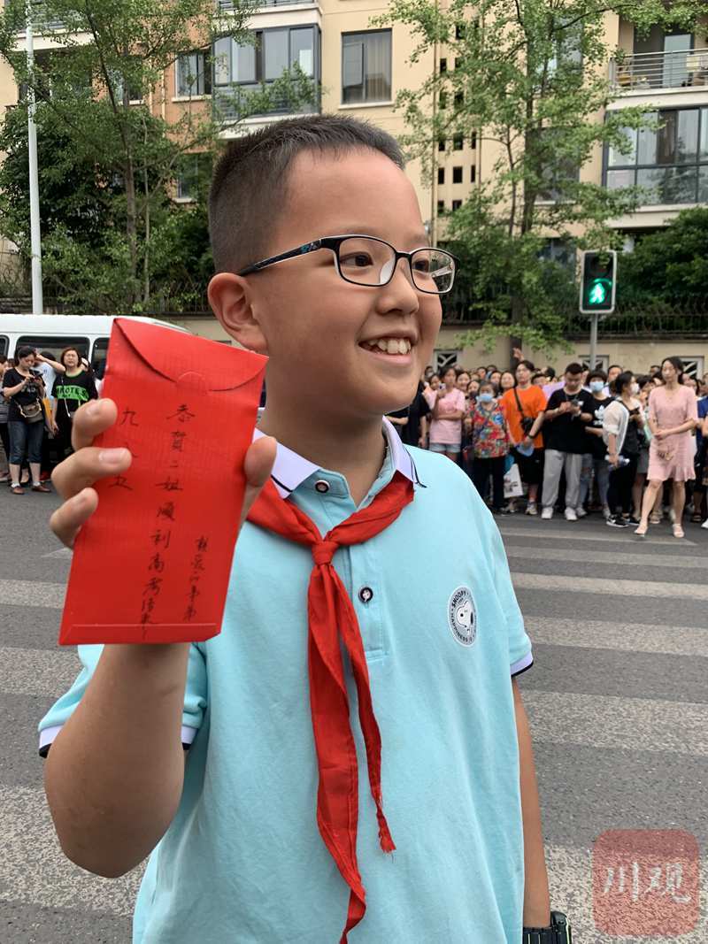 川观新闻记者在四川师大附中考点看到,一位小学生手中拿着红包,上面写着“九八五 恭贺二姐顺利高考结束!”,落款为“亲爱的弟弟”。记者了解到,这个红包是由这位小学生妈妈即考生姨妈为考生准备的小礼物,本来准备送1000元,但该考生表弟建议就送985元,“希望姐姐考上985一样的好学校!”