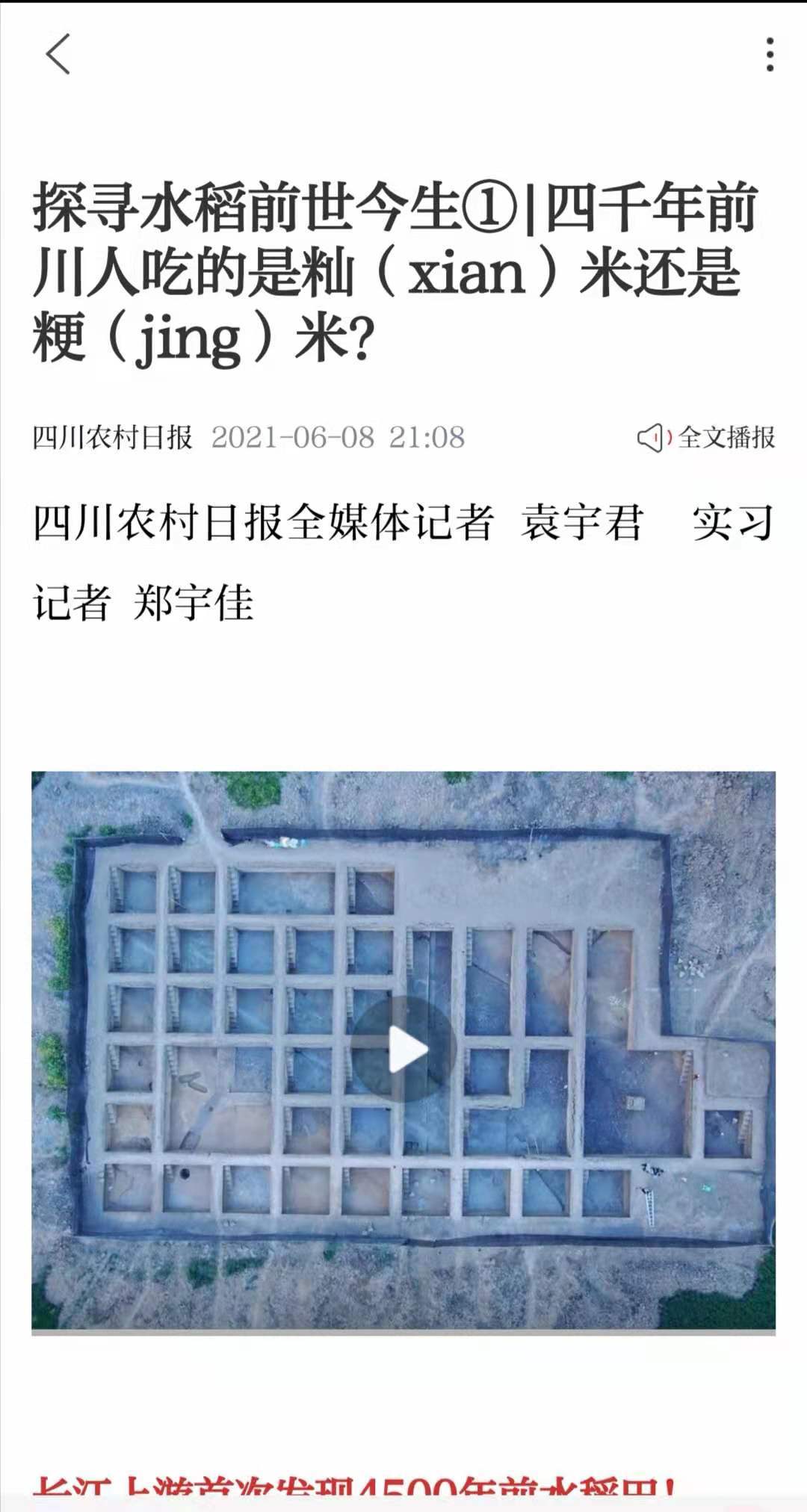 昨天,四川农村日报推送的一条稿件《探寻水稻前世今生①|四千年前川人吃的是籼(xian)米还是粳(jing)米?”》