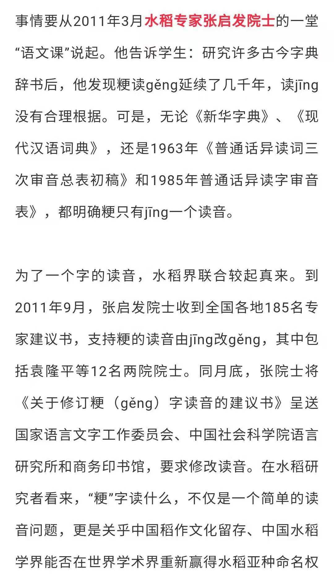 于是,为了一个字的读音,水稻界联合较起真来。到2011年9月,张启发院士收到全国各地185名专家建议书,支持粳的读音由jīng改gěng,其中包括袁隆平等12名两院院士。同月底,张院士将《关于修订粳(gěng)字读音的建议书》呈送国家语言文字工作委员会、中国社会科学院语言研究所和商务印书馆,要求修改读音。