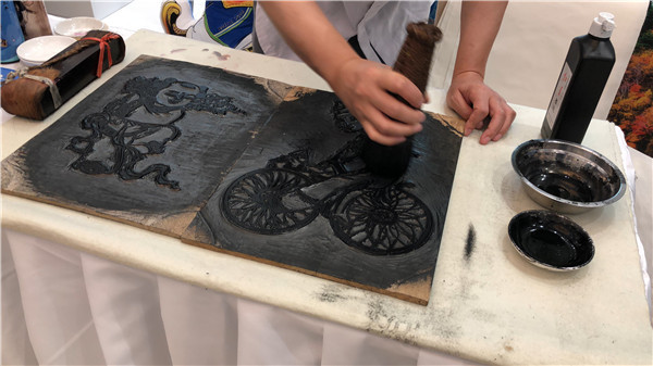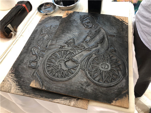 胡光葵是绵竹年画这一非物质文化遗产的传承人,他现场印制了一幅“骑车仕女图”。