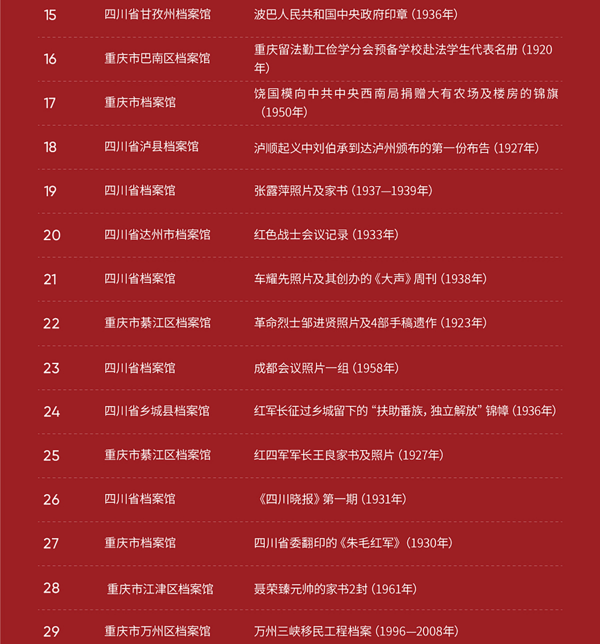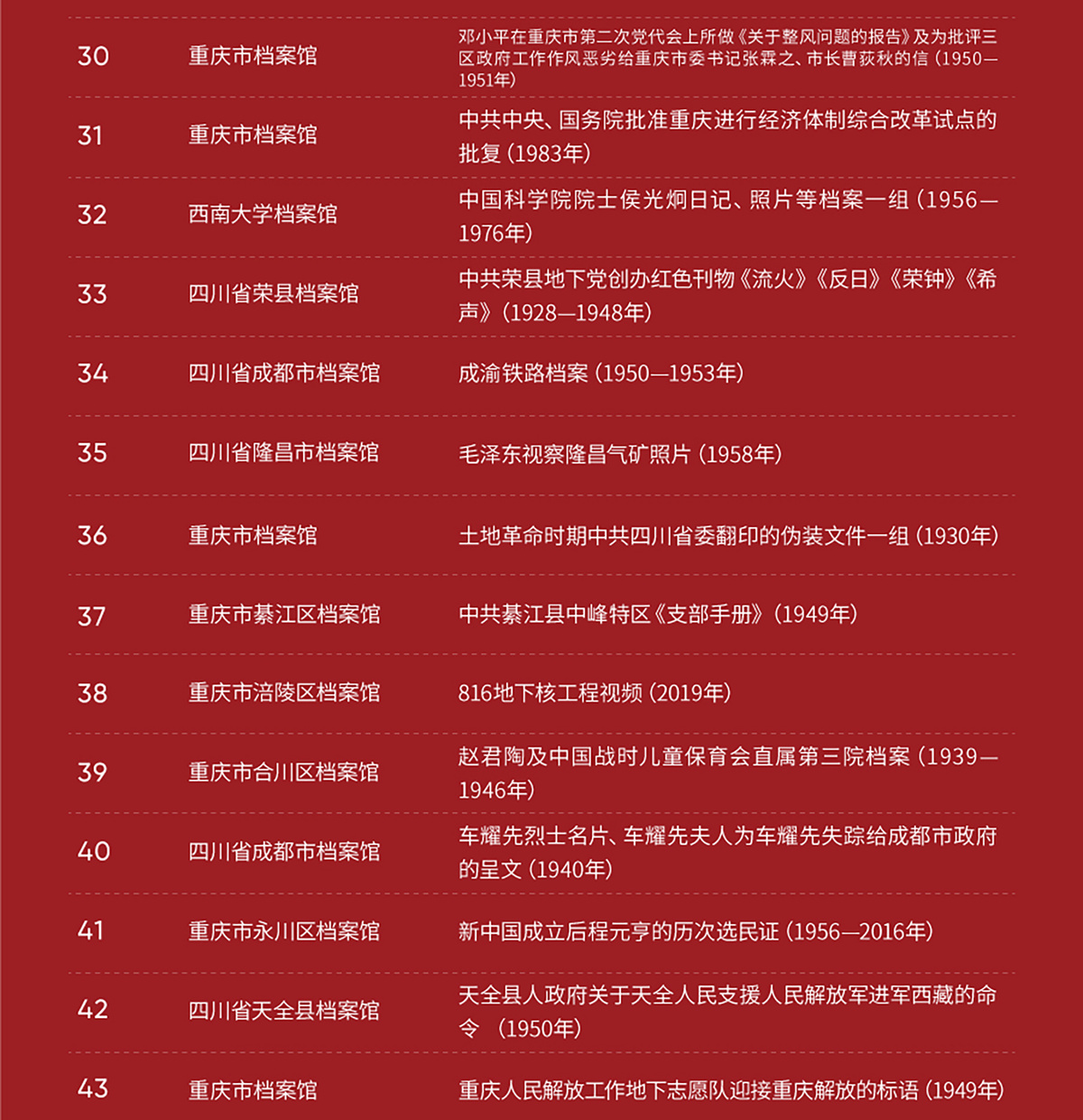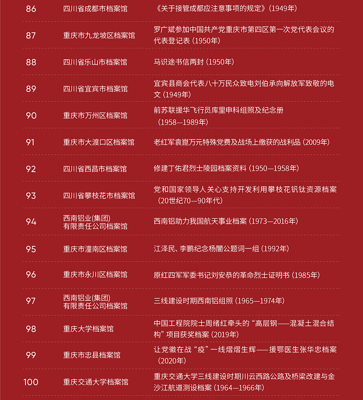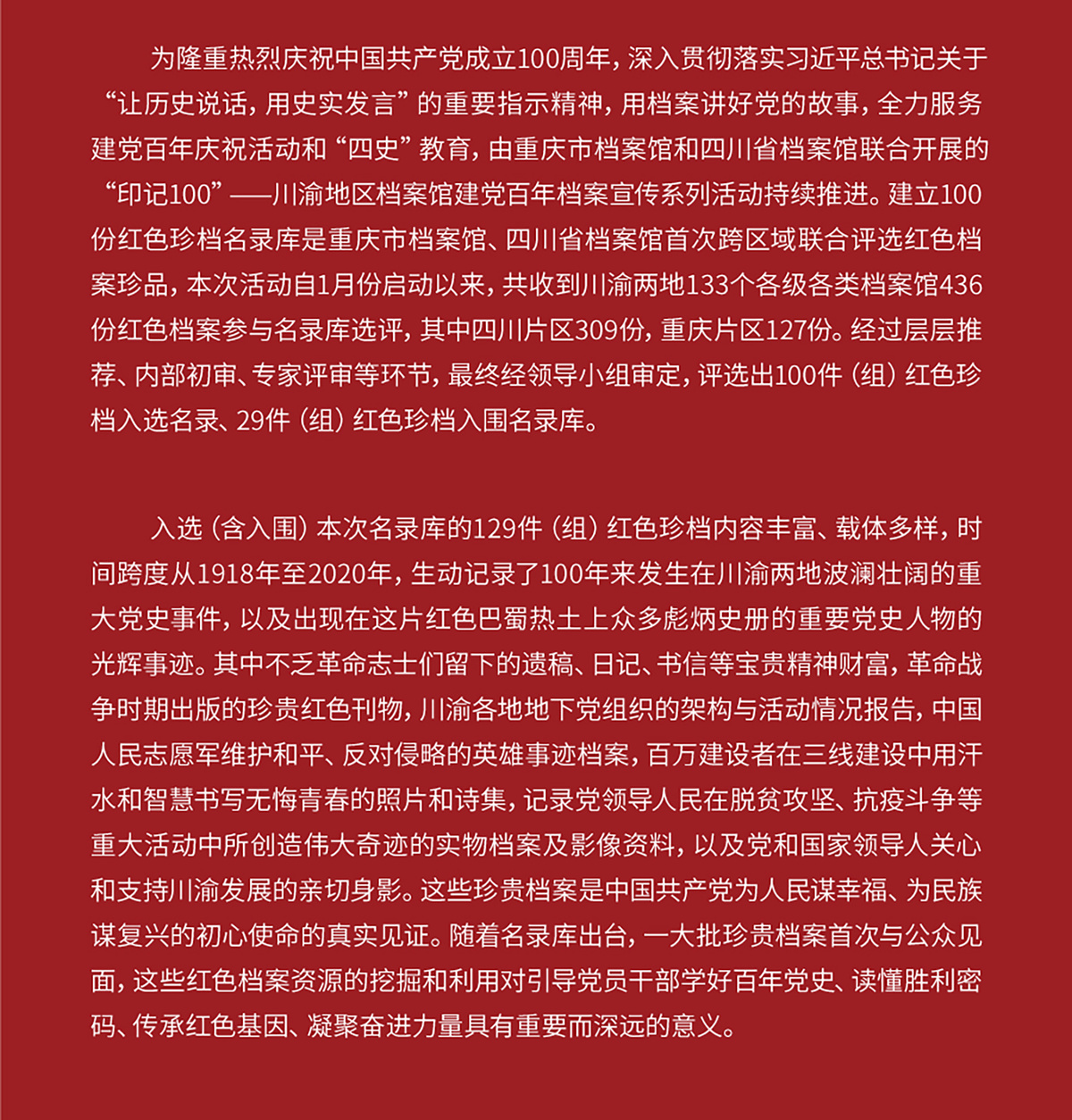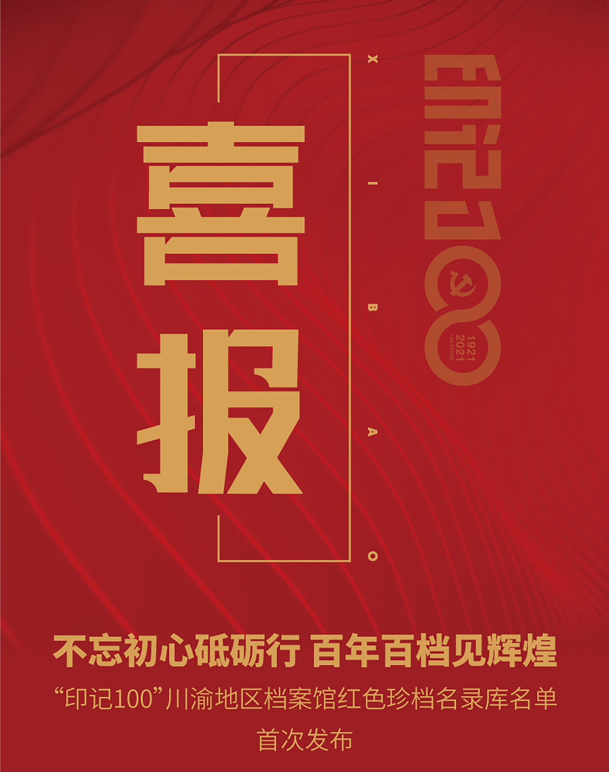 为庆祝中国共产党成立100周年,用档案讲好党的故事,全力服务建党百年庆祝活动和“四史”教育,四川省档案馆和重庆市档案馆首次跨区域联合评选红色珍档。