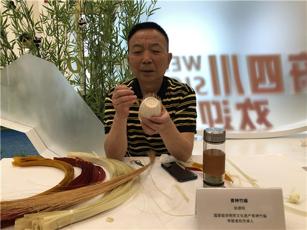 “我把这个杯子编好,大概要用16个小时。”发布会结束后,成就展展厅内摆放着青神竹编展品的桌子边,国家级非遗青神竹编传承人之一的张德明正手拿一个瓷杯,向观众展示着竹编的魅力。细如发丝的竹丝包裹着瓷器,精致的质感和视觉效果,让这里不一会儿就围满了人。
