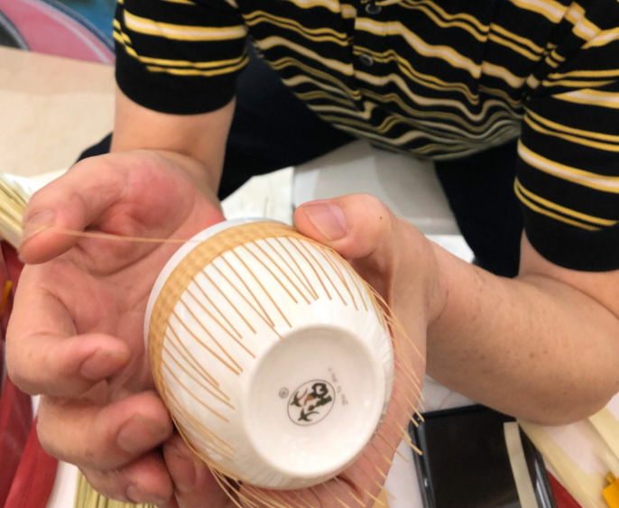 几年前,青神竹编的艺术性和观赏性,让世界顶级品牌爱马仕找到张德明寻求合作,张德明运用自己首创的双线交叉走丝竹丝扣器皿的新编法,经过三年的反复打样,成功将纤细的竹丝套在了各式瓷器上,这样的工艺获得了爱马仕的高度认可,双方也开始了长期合作。