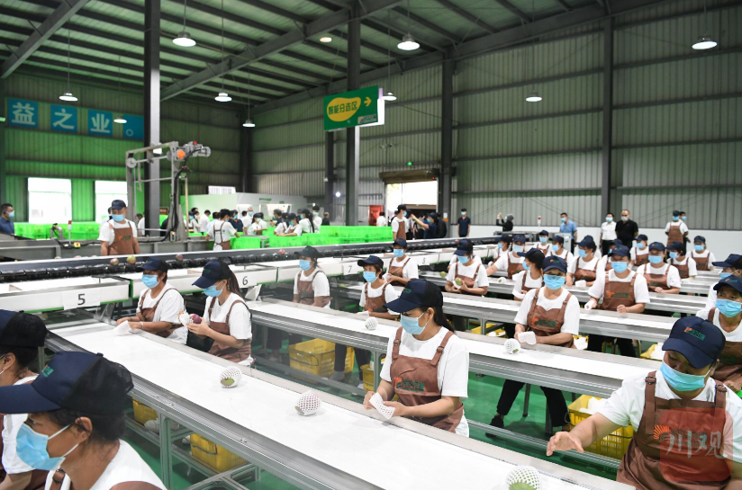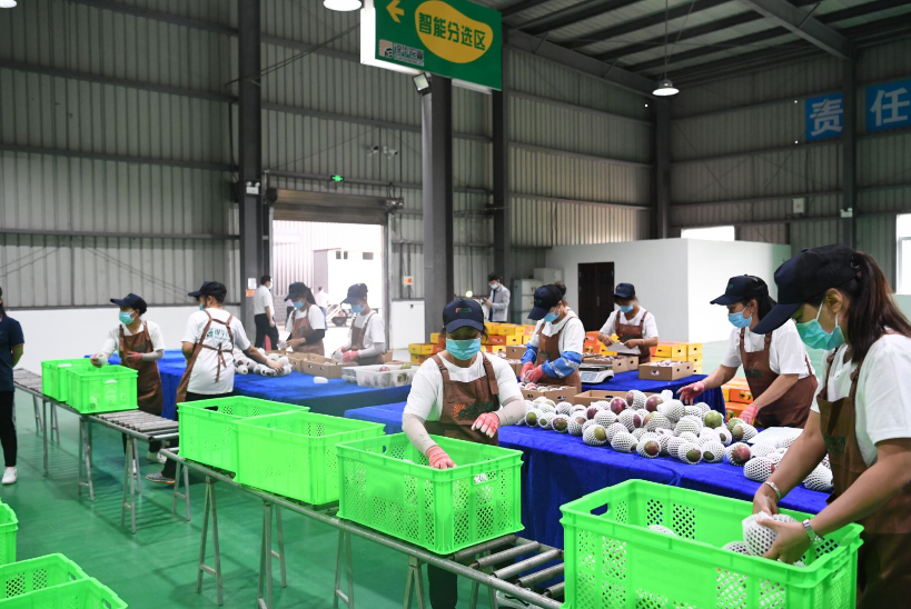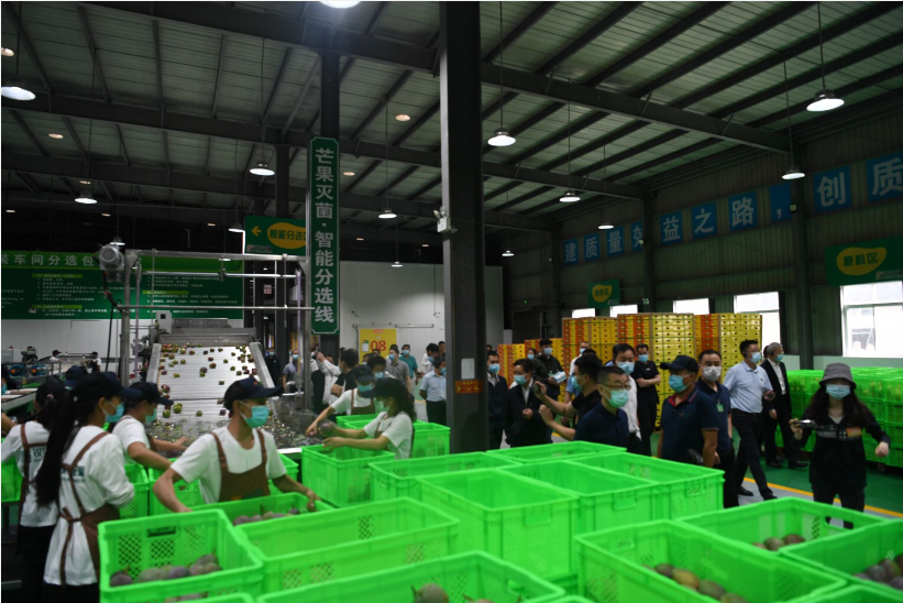 在锐华农业冷链物流中心果蔬分选加工车间,不仅可以对果蔬进行清洗灭菌、标准分选、包装贮藏、集配物流,还拥有国内首条芒果智能分选线,日分选加工能力达50万斤。