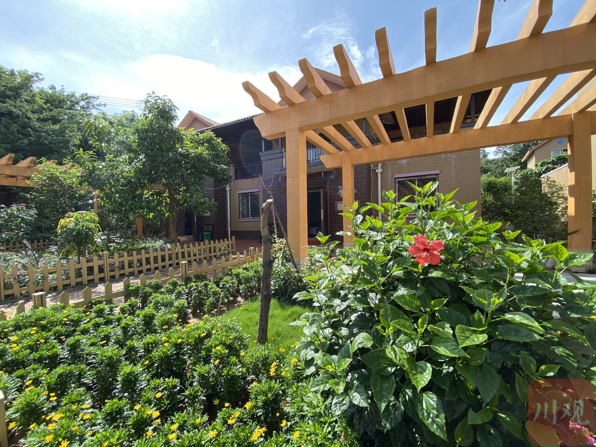 “名如其村,果真是在‘鲜花里’。”6月10日,米易县撒莲镇禹王宫村里绿树成荫,花香怡人,沿着整齐的石板路一路走,两旁的三层小楼一栋挨着一栋,和楼下院落的木质围栏相映成趣。