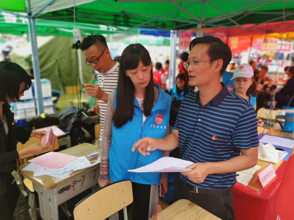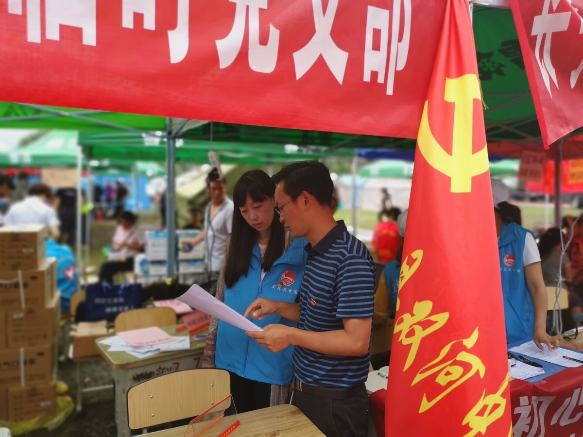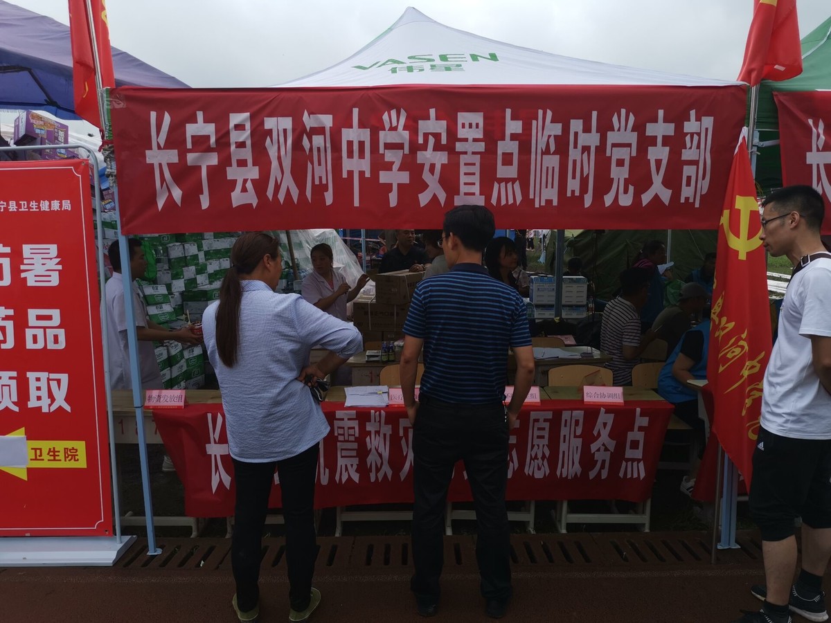6月19日中午,一面鲜红的党旗立在了双河中学安置点的入口处。长宁县委组织部常务副部长廖青龙正在和临时党支部书记刘志聪讨论党支部分工名单。