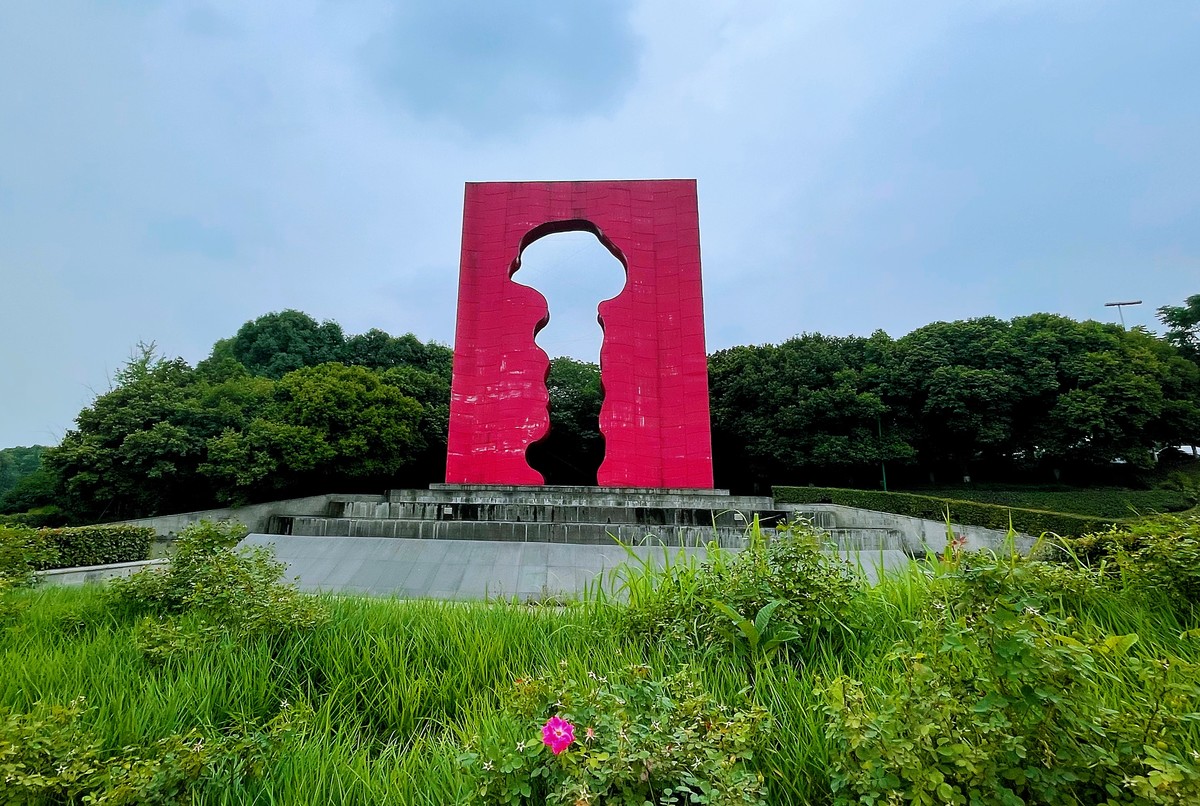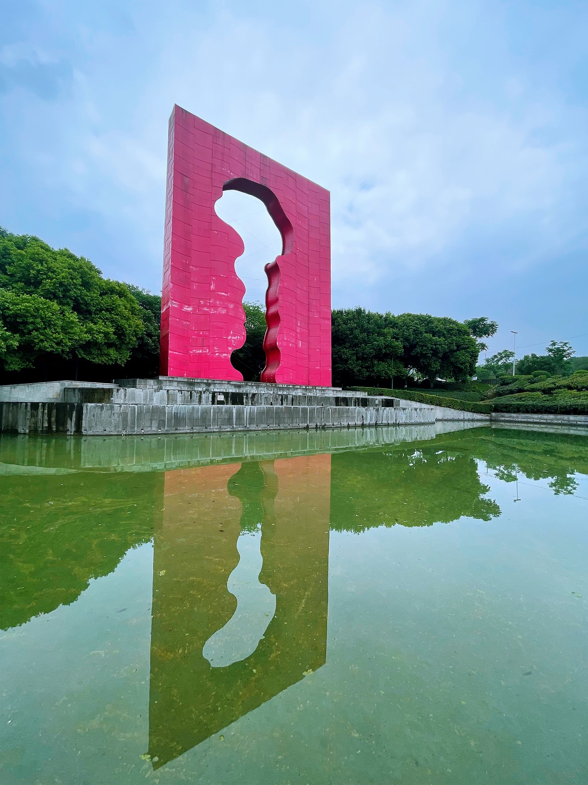 从成绵高速公路磨家收费站驶入绵阳城区,许多外地人都会被路口的一个巨大雕塑所吸引。这座红色的长方形雕塑,其中间镂空的图案也引发许多人的猜测——是一把钥匙?还是一朵蘑菇云?