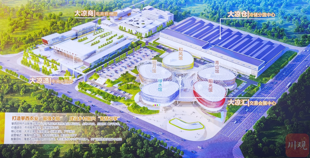 攀西农特产品智慧运营中心由大凉汇(交易会展中心)、大凉仓(仓储物流中心)、大凉商(产业融合园)、大凉造(中央大厨房)四大板块组成,以“互联网+”为纽带,以农业种植为依托。