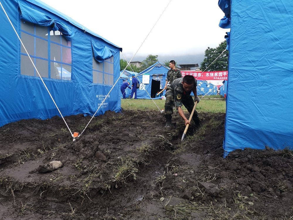 据武警宜宾支队副队长崔建宁介绍,该安置点排水沟大致按照30*30cm的规格进行施工,在今天内要将安置点内全部排水沟形成排水网,通过学校双河中学运动场的原有排水沟进行排水。