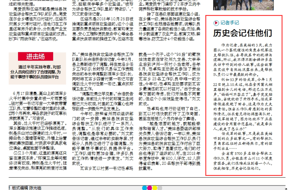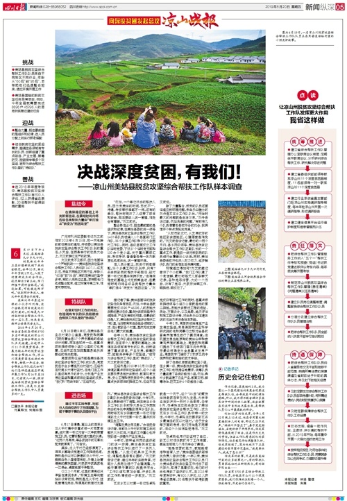 6月20日,四川日报5版刊发了记者付真卿的调查稿件《决战深度贫困,有我们!——凉山州美姑县脱贫攻坚综合帮扶工作队样本调查》,并配发了记者手记。