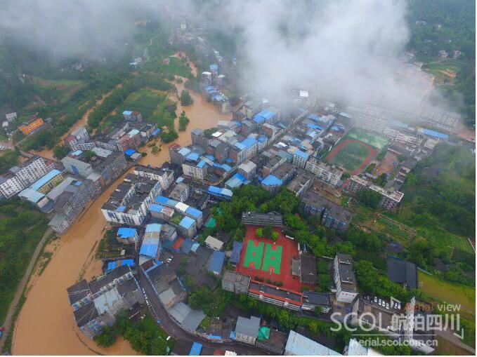 6月20日晨,巴中市遭强降水袭击。恩阳区茶坝镇、群乐镇等多个乡镇街道路面被淹。这是上午在茶坝镇人民政府附近拍摄到的航拍画面,看得出目前雨势已减弱,茶坝镇水势渐退。施皓文 摄