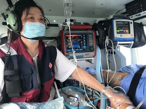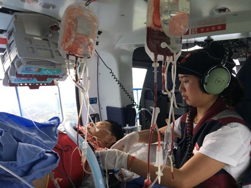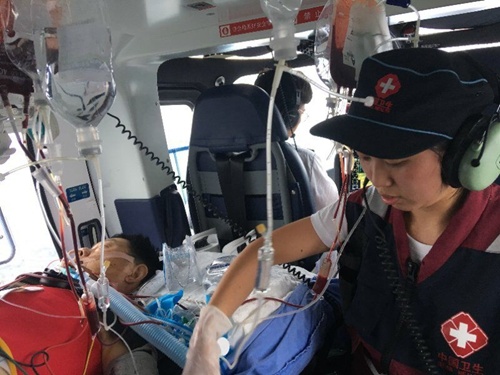12:30 前后方救援指挥部协调航空资源,申请航空救援并做相关准备工作,途中可能遇到的所有问题都必须提前考虑,周密计划。我作为此次应急小分队唯一的重症医学科医生,转运由我护送。此后时间便一直待在监护室,密切关注伤员情况,为转运做准备。