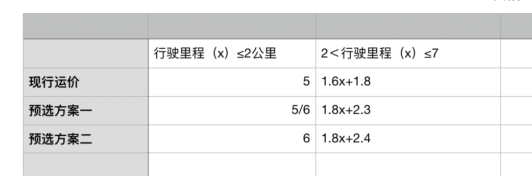 记者发现,两个预选方案的主要差别在于起步价,方案一的白天起步价相当于每公里3.3元,方案二相当于每公里3元;当行程超出2公里又在7公里以内的,二者的差价为0.1元,按四舍五入计算后,几乎是相同的。