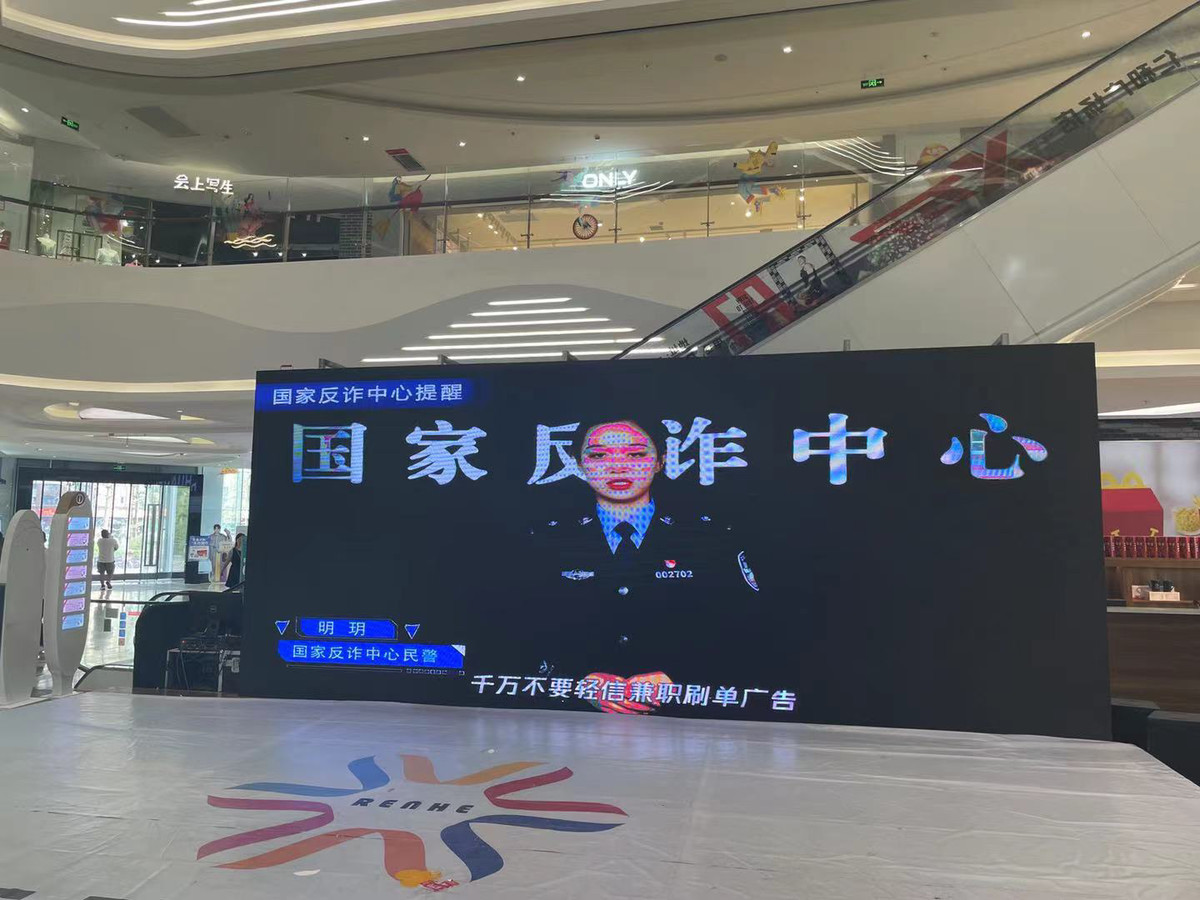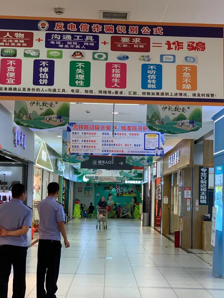 而在商场,反诈中心则是把经典的反诈视频“搬”到了商场的大屏幕上,各自反诈宣传“占领”了不少通道和出口。