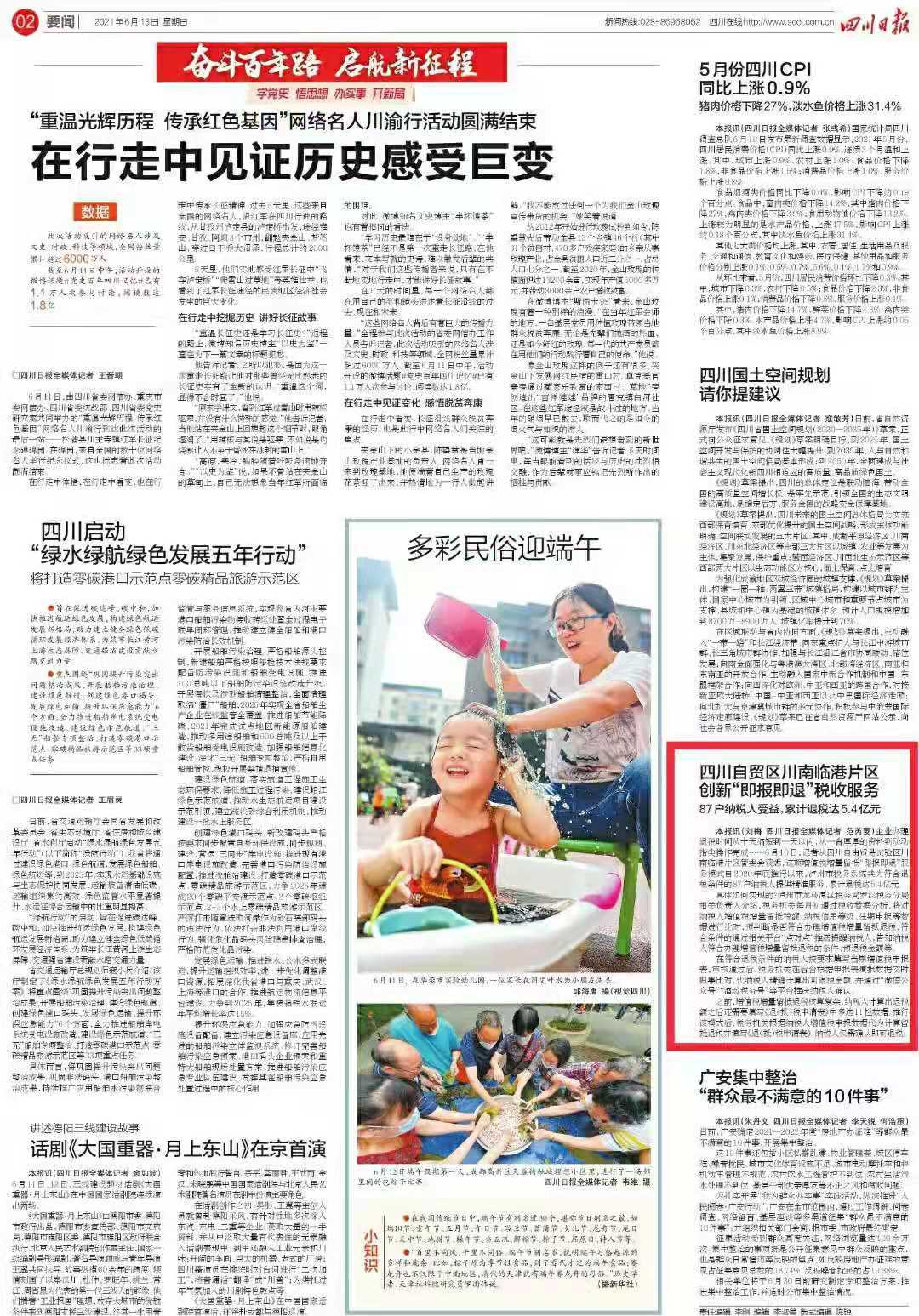 企业办理退税时间从十天缩短到一天以内,从一沓厚厚的资料到动动指尖操作完成……6月10日,记者从四川自由贸易试验区川南临港片区管委会获悉,这项增值税增量留抵“即报即退”服务模式自2020年底推行以来,泸州市税务系统共为符合退税条件的87户纳税人提供精准服务,累计退税达5.4亿元。