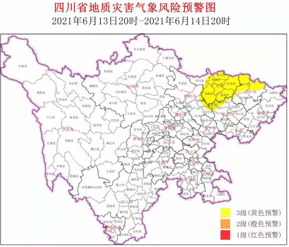 6月13日,四川省地质灾害指挥部办公室结合四川省气象台天气预报情况,发布地质灾害气象风险预警:6月13日20时~6月14日20时,四川地灾预警范围较前一日有所扩大,主要集中在川东北地区,共有4个市的15个县(区、市)进入黄色预警范围。