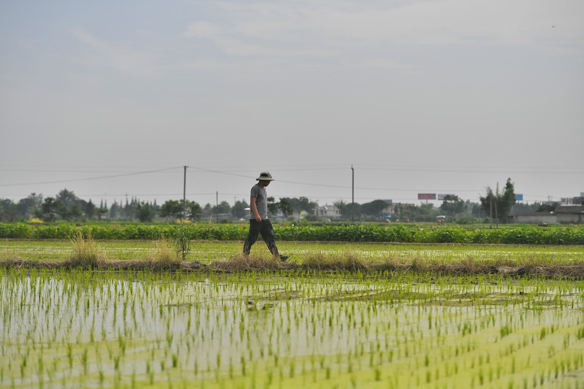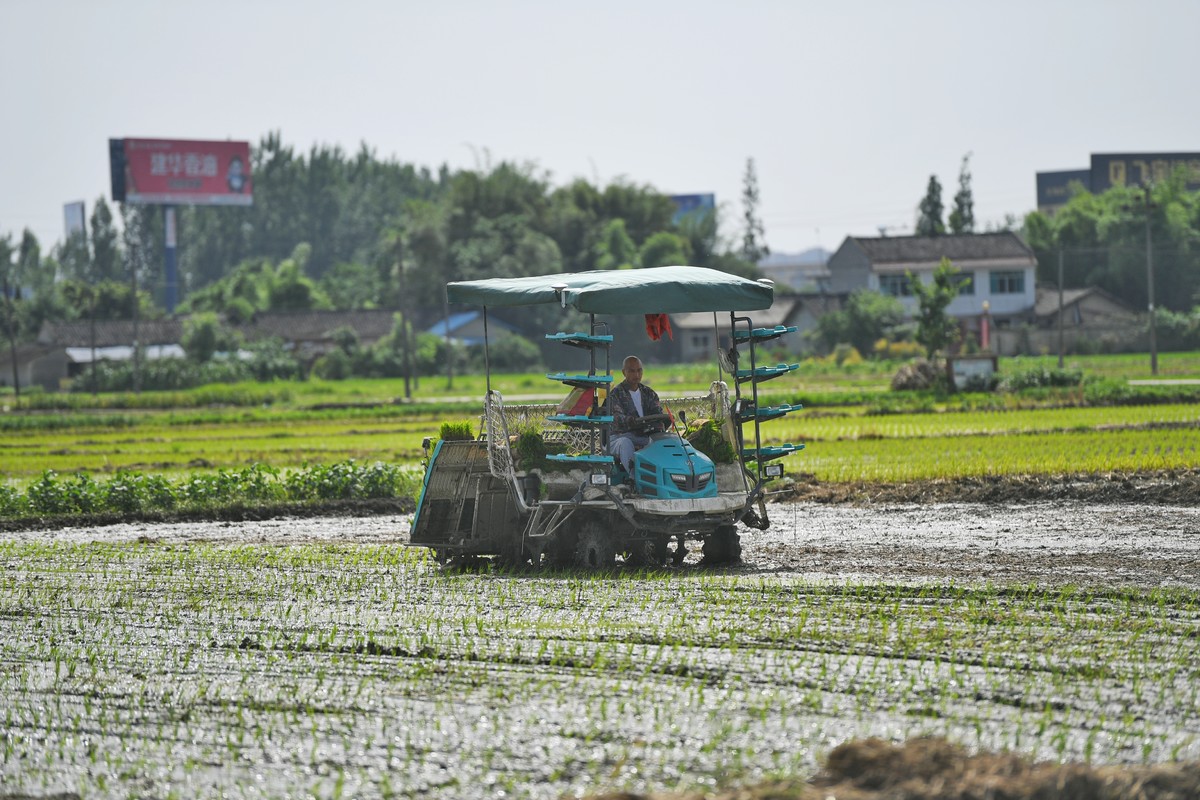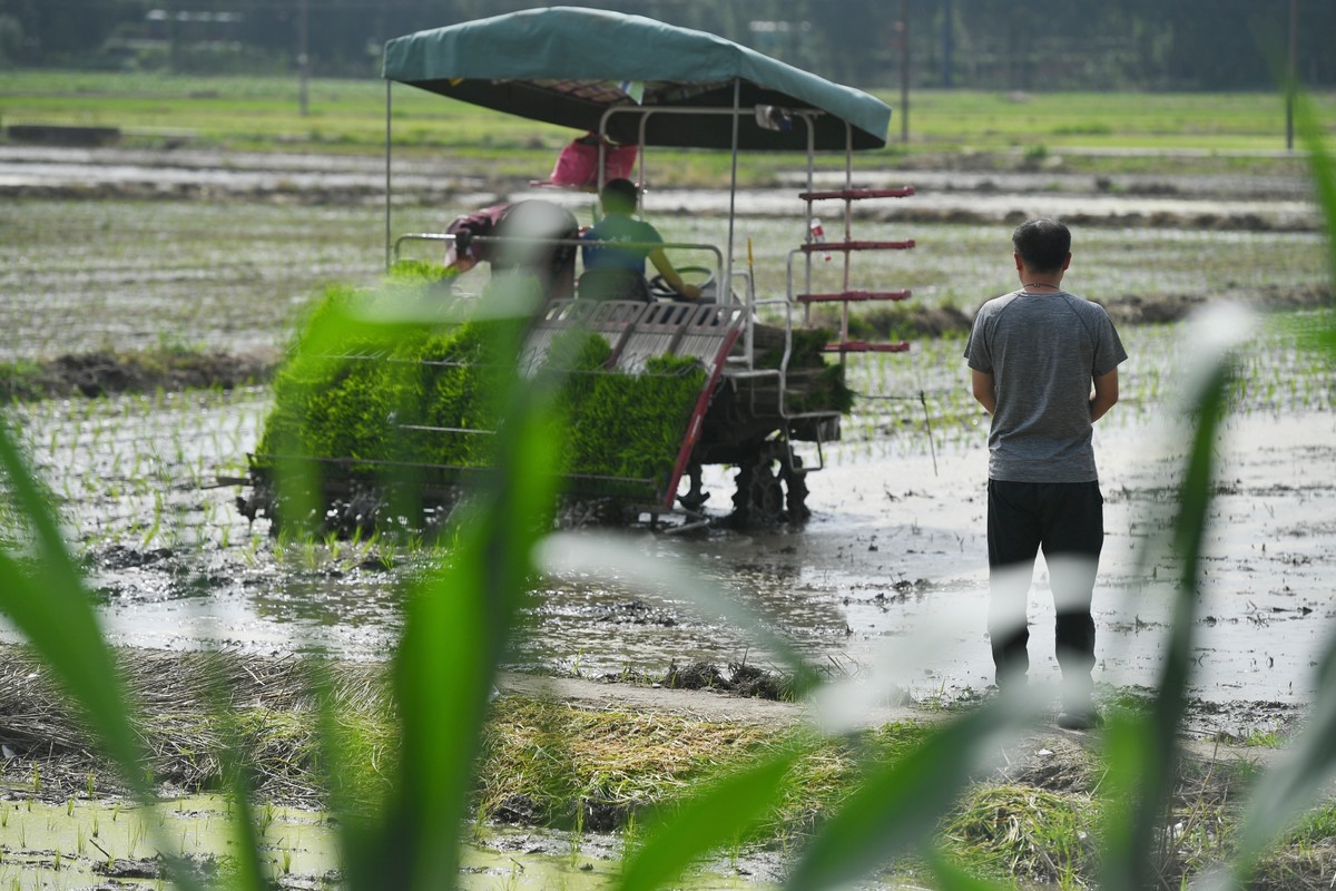 6月4日,广汉市金鱼镇亭江社区的百亩农田里,两台插秧机来回穿梭,不一会儿,田里就竖起一排排嫩绿的秧苗。