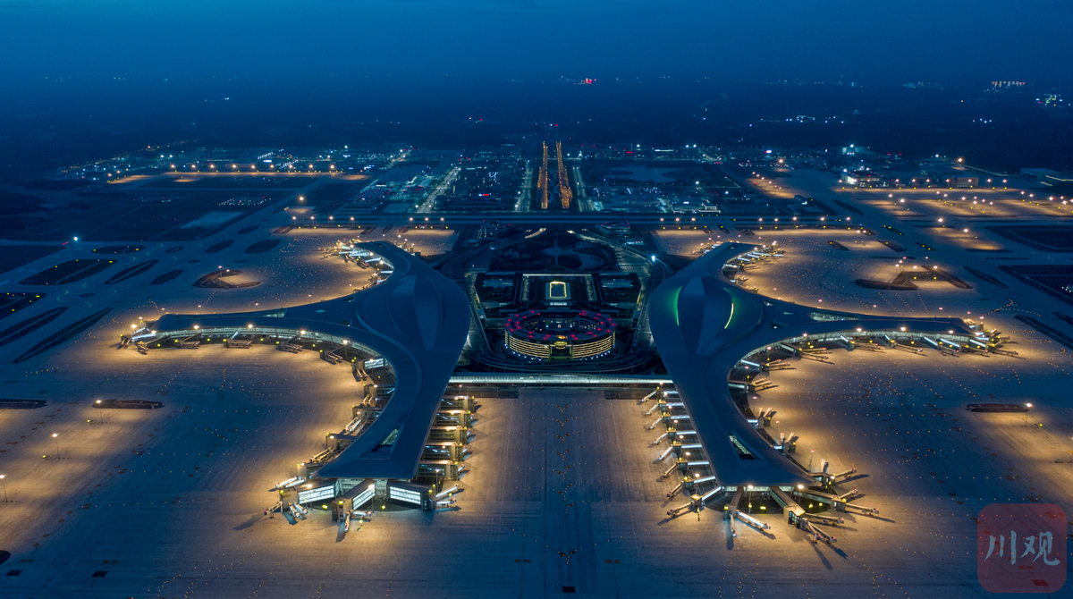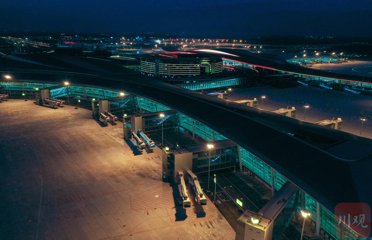 “天府之眼”的远处,4000米长的西一跑道上,助航灯光在夜色中绽放,宛如繁星点点一直延伸到浩瀚星空。