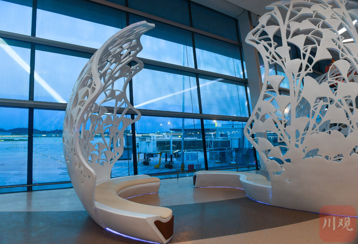 夜里8点,“天府之眼”发出蓝光,太阳神鸟的图案在夜色中亮得耀眼。成都天府国际机场投用后,“天府之眼”是新机场最好的打卡地,站在那里北可俯瞰整个酒店中央内景,南可观停机坪飞机起落。