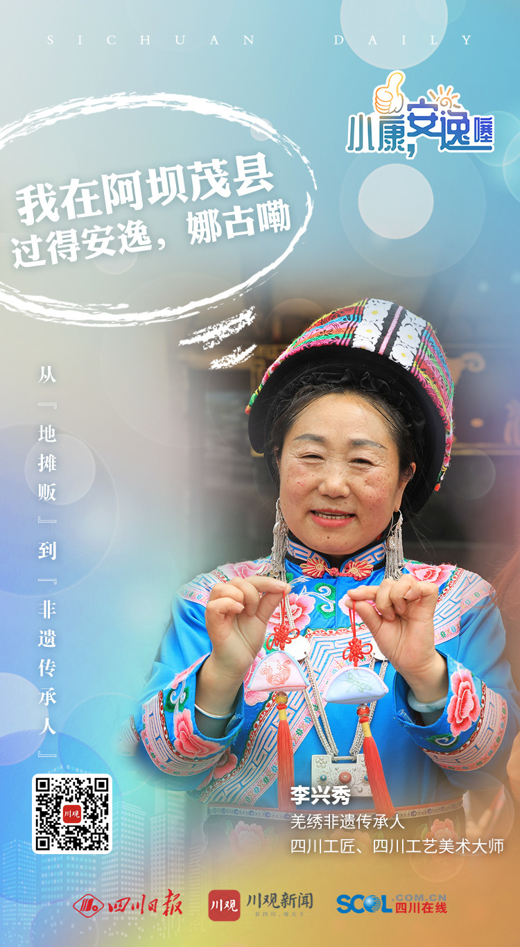 李兴秀是当地知名的绣娘。20多岁时,她在茂县、北川等地摆地摊,还帮人在布料上画花、扎花。如今,与羌绣打了30多年交道的她已是省级非遗传承人,并有“四川工匠”“四川工艺美术大师”等称号。