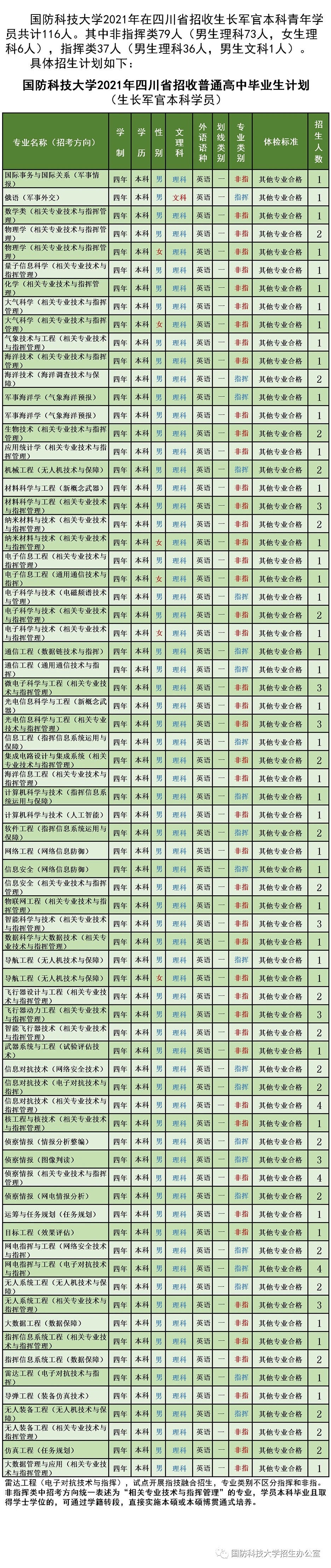 6月15日,记者从省教育考试院获悉,经教育部和军委机关批准,国防科技大学2021年招收普通高中毕业生计划(生长军官本科学员)正式发布,其中国防科技大学2021年在四川省招收生长军官本科青年学员共计116人,其中非指挥类79人(男生理科73人,女生理科6人),指挥类37人(男生理科36人,男生文科1人)。
