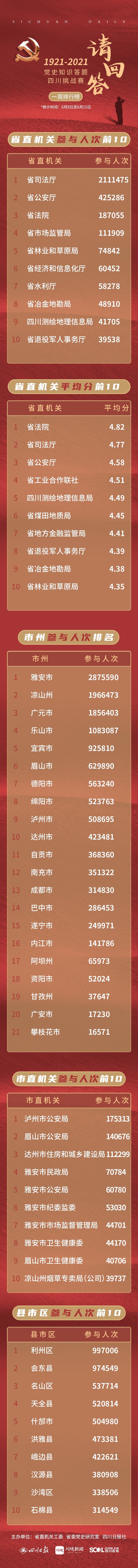 截至6月15日,“请回答1921-2021”——党史知识答题四川挑战赛(机关党员干部专场)已持续10周,答题人次达到2359万人。