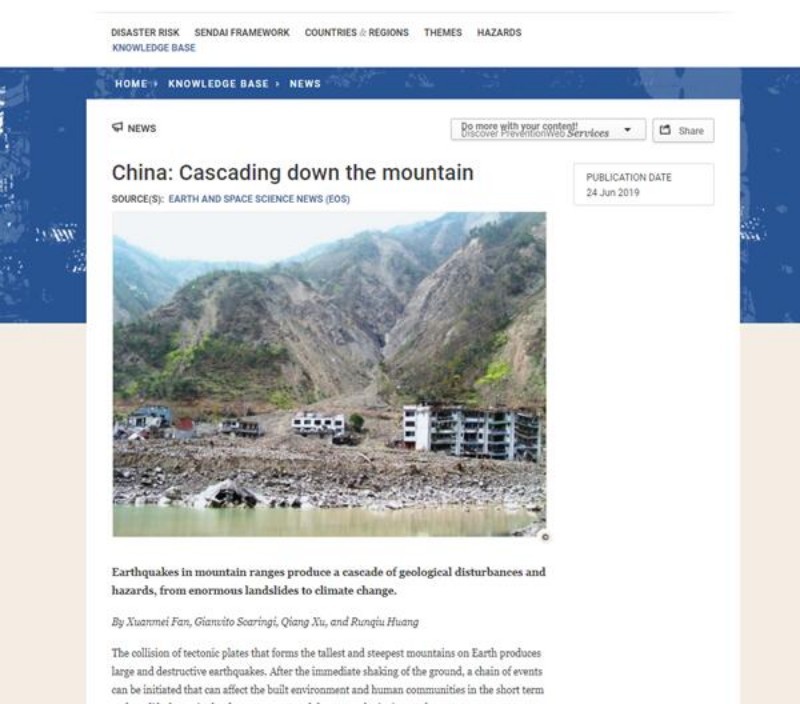 该论文日前还被主编选为亮点论文,受到了联合国防灾减灾署的关注,被作为重要研究进展报道;同时也受到了美国地球物理协会(AGU)会刊 EOS(地球与空间科学新闻)Editor’s Vox特别报道与推送。《Earth’s Future》主编,英国地质调查局Michael A. Ellis教授评价评价该文为“地震诱发地质灾害‘殿堂’级别的论文(The bible of earthquake-triggered hazards).”