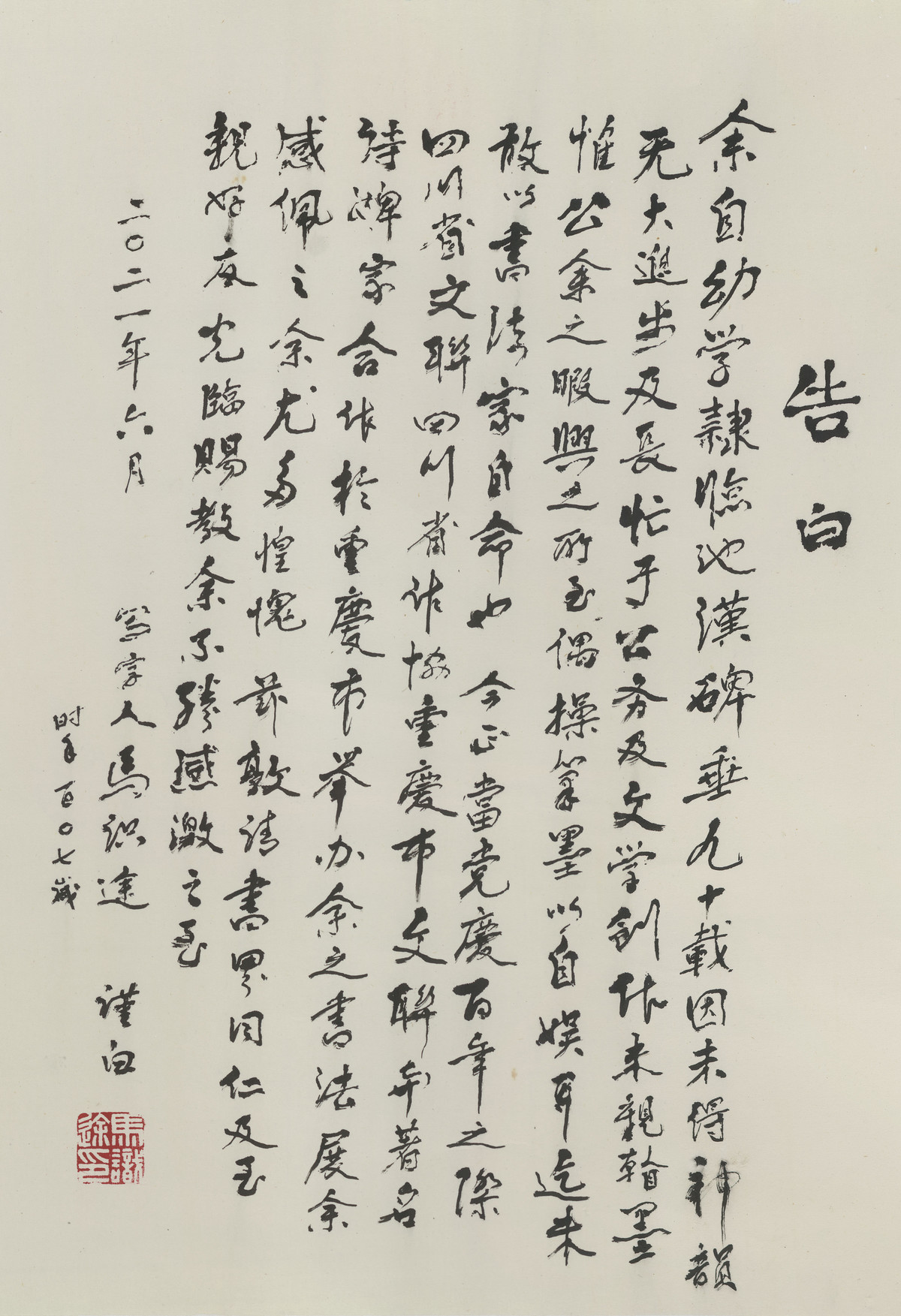 今正当党庆百年之际,四川省作协、四川省文联、重庆市文联,与著名诗婢家合作于重庆市,举办余之书法展。余感佩之余,尤多惶愧,兹敦请书界同仁及至亲好友光临赐教,余不胜感激之至。