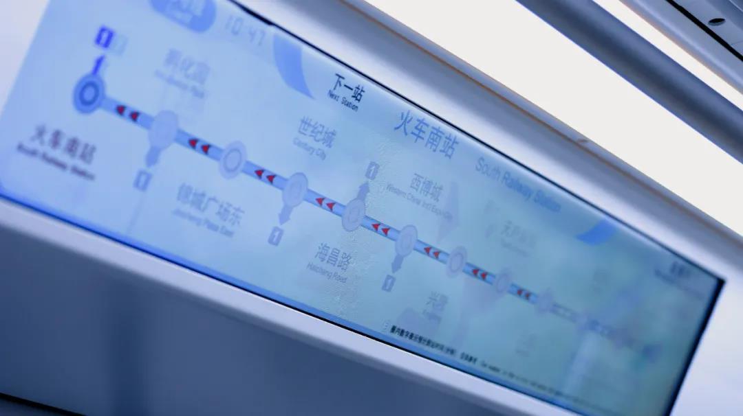火车南站特别为18号线准备的综合信息屏,上方显示导向信息,下方显示列车终点站、到站时间信息。搭乘地铁的朋友可以提前掌握列车到达情况。在18号线列车车内配备了横屏LED显示屏,可提前显示预计到达时分、站点便民服务设施位置等服务信息,助力乘客便捷出行。
