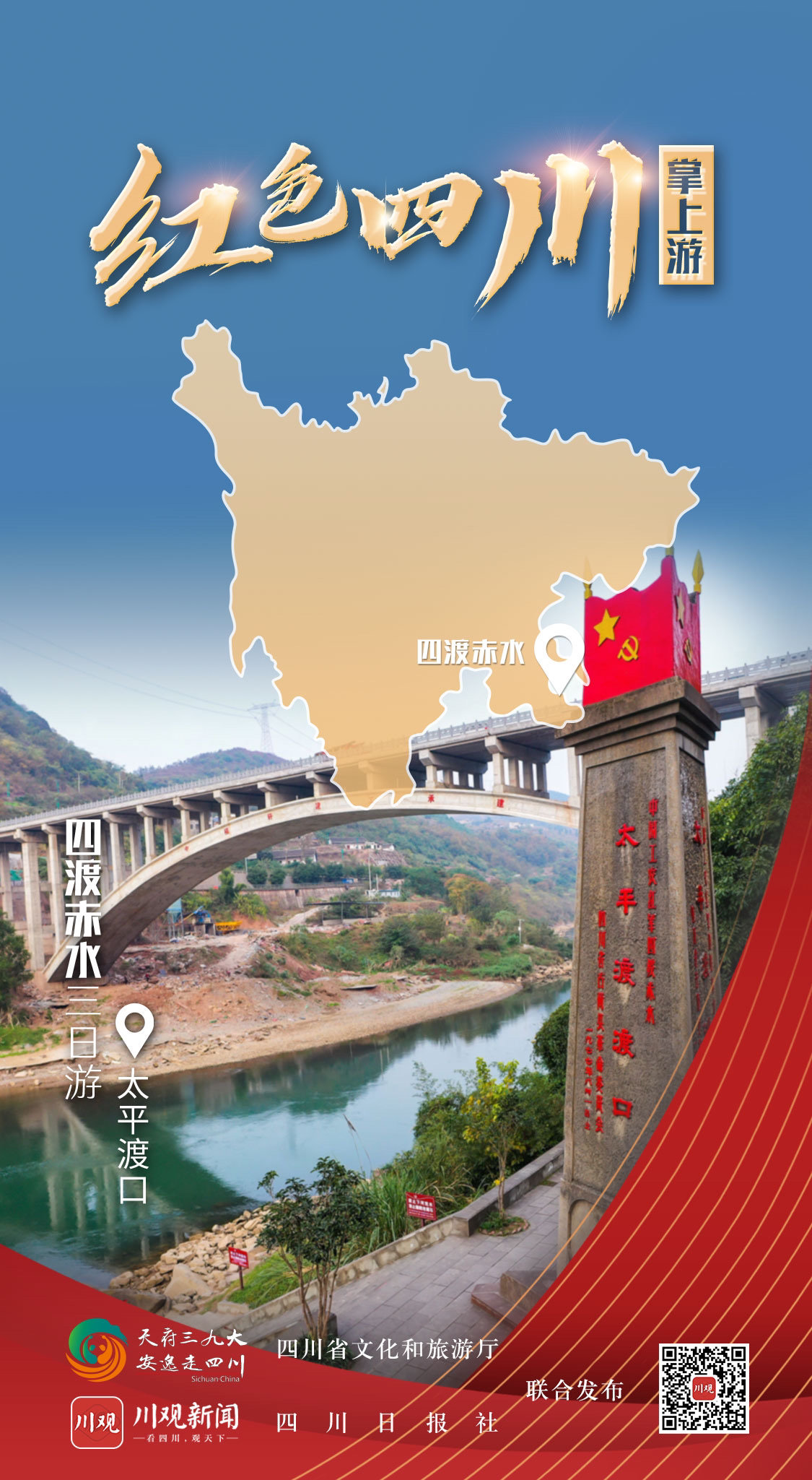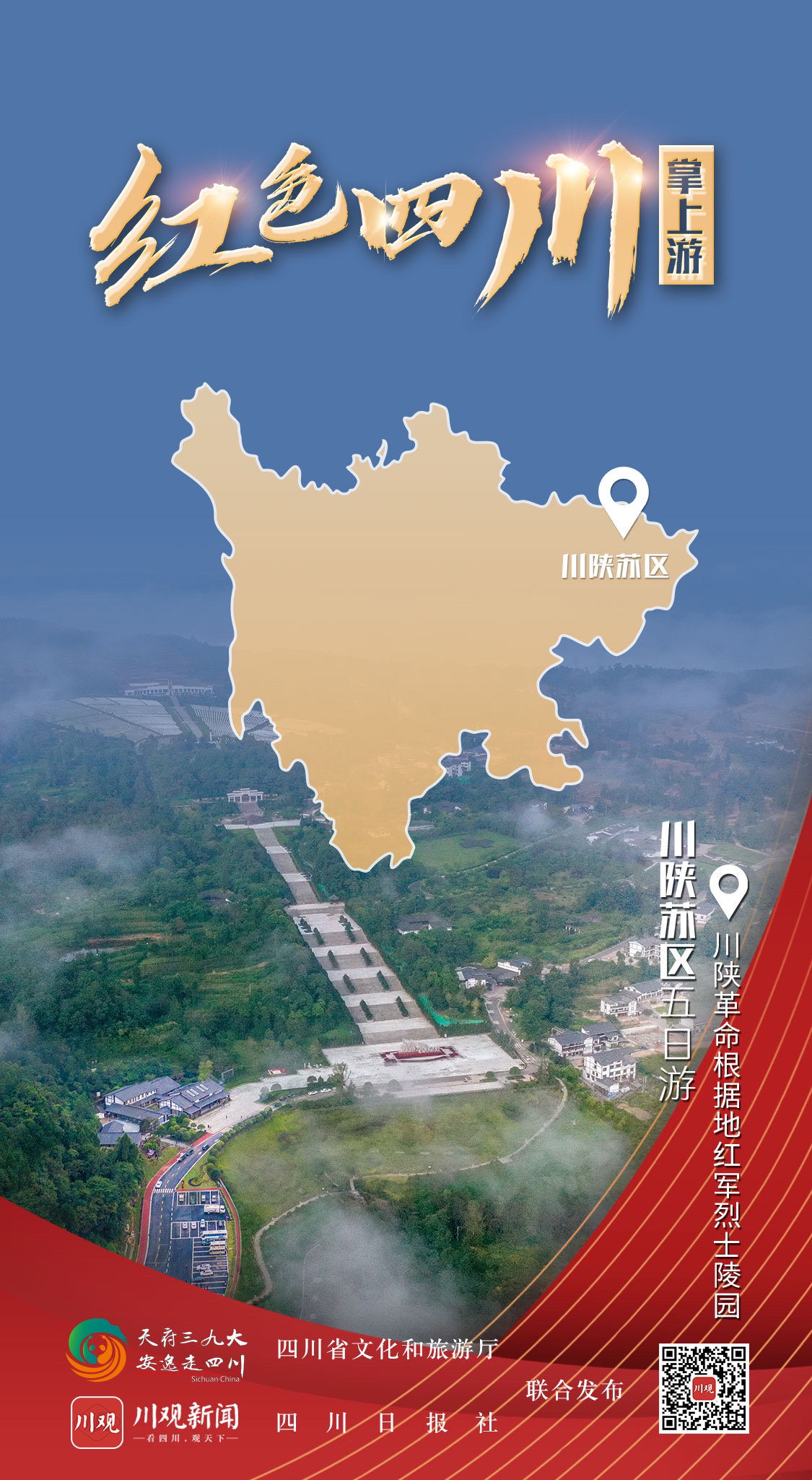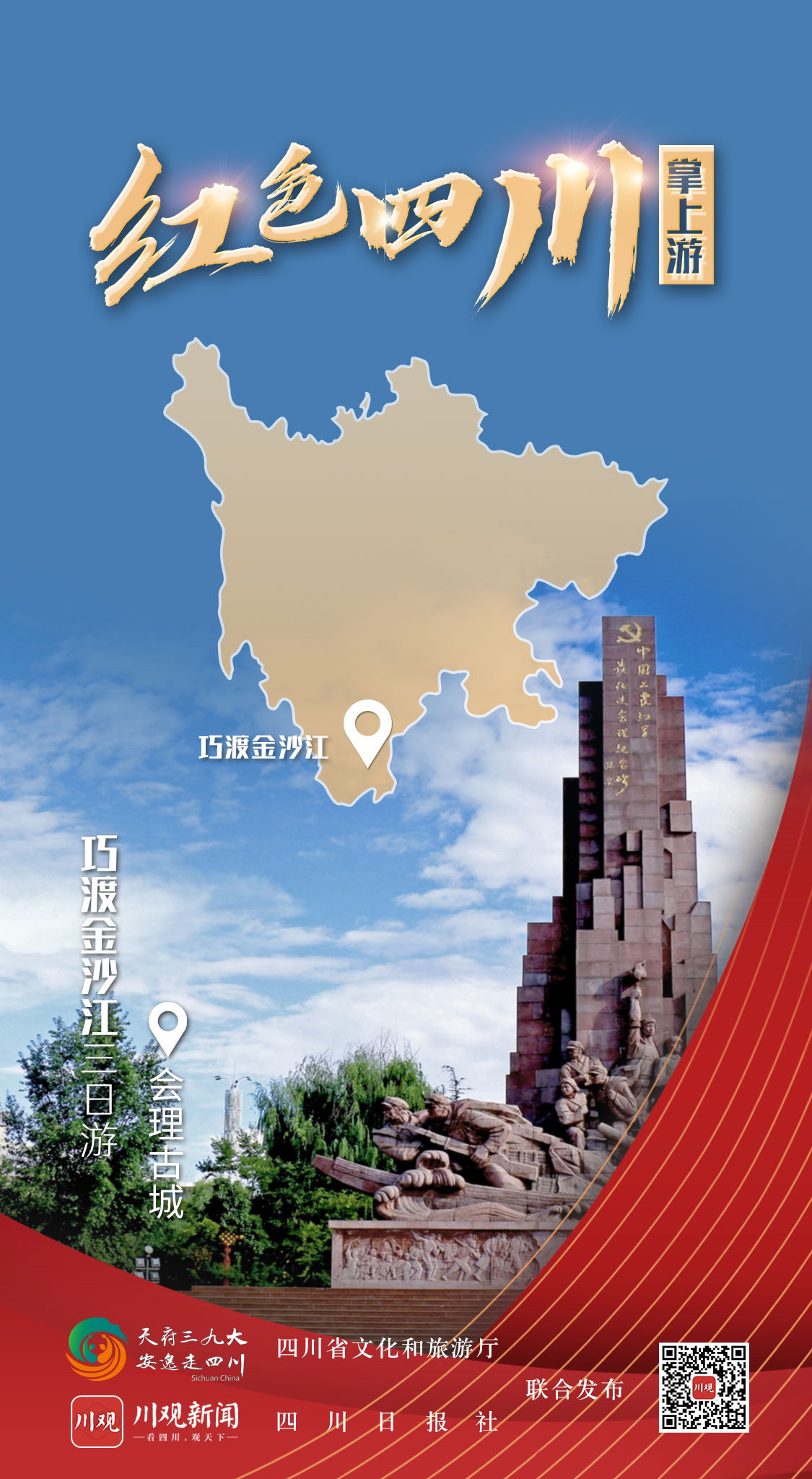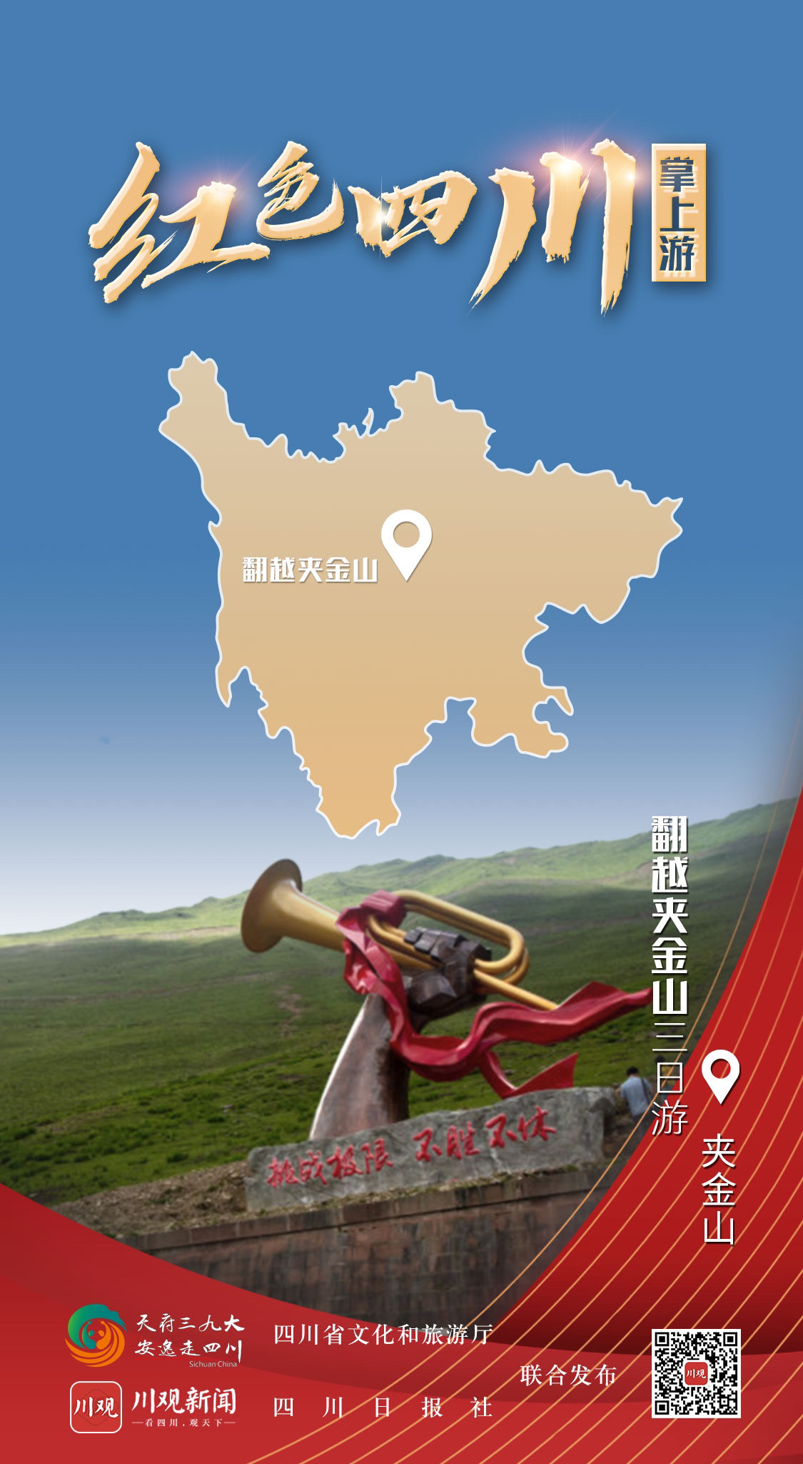 据了解,由四川省文化和旅游厅和四川日报社联合制作的“红色四川掌上游”全新交互式H5即将与广大网友见面,创意海报只是先上一道“前菜”。通过红色旅游创意海报,网友可通过交互式H5线上体验四川红色景区景点,收获不同类型的壮丽山河画卷,感受红军长征精神,还可扫描二维码进入四川日报·川观新闻客户端的“红色四川掌上游”专题,获取经典红色线路上的旅游亮点。