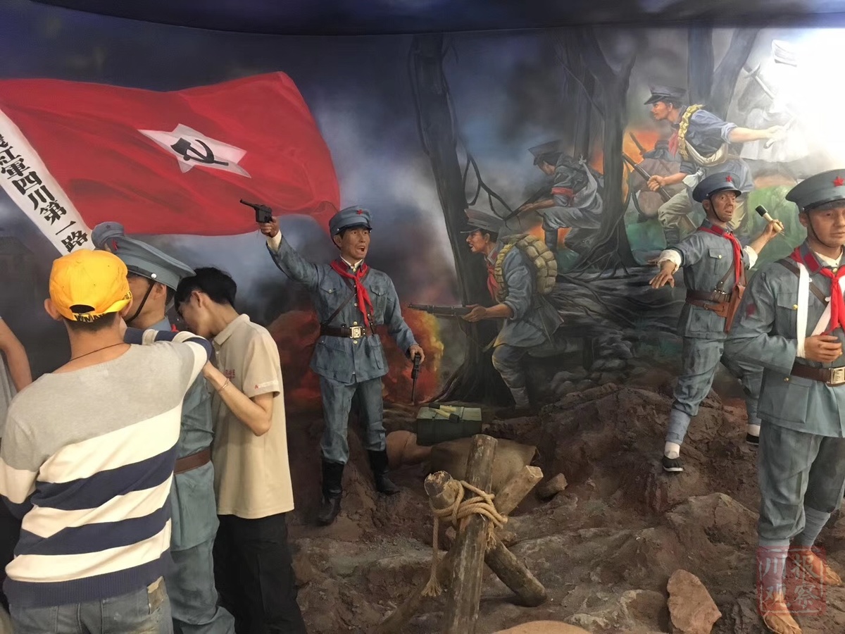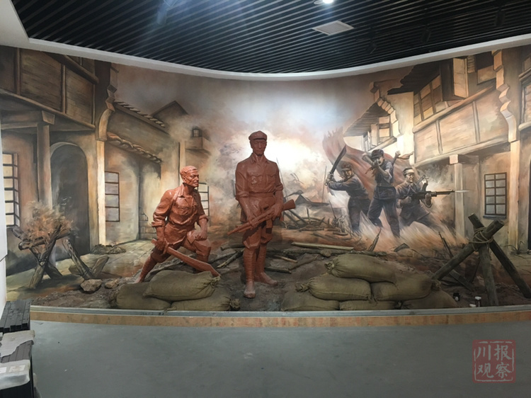 王旭辉说,在设计《攻打蓬溪县城》浮雕图案时,设计师采用了逼真的硅胶人物,用真实服装、武器等写实风格全景壁画,结合声光电、3D投影等现代技术综合展现气势恢宏的战 争场景,让观者触摸到真实的历史。