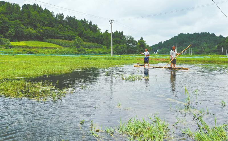 6月27日,在简阳市禾丰镇碑垭村,当地村民在稻虾田里给小龙虾喂黄豆。 本报记者 李向雨 摄