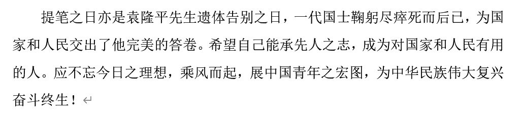 或许有遗憾,但更多的是勇往直前的勇气,彰显当代青年的责任与担当。一位同学写道:“提笔之日亦是袁隆平先生遗体告别之日,一代国士鞠躬尽瘁死而后已,为国家和人民交出了他完美的答卷。希望自己能承先人之志,成为对国家和人民有用的人。应不忘今日之理想,乘风而起,展中国青年之宏图,为中华民族伟大复兴奋斗终生!”