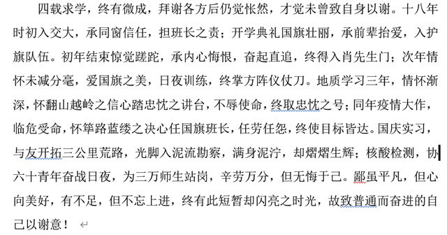 “我虽平凡,但心向美好,有不足,但不忘上进,终有此短暂却闪亮之时光,故致普通而奋进的自己以谢意!” “文轨车书致大同,我行走在西部的公路上,跨越天堑的大桥、横贯山脉的隧道就是交大人佩戴在祖国大地上的功勋章。”毕业生们不仅感谢自己在这四年付出的努力,更加感谢学校的悉心培育。