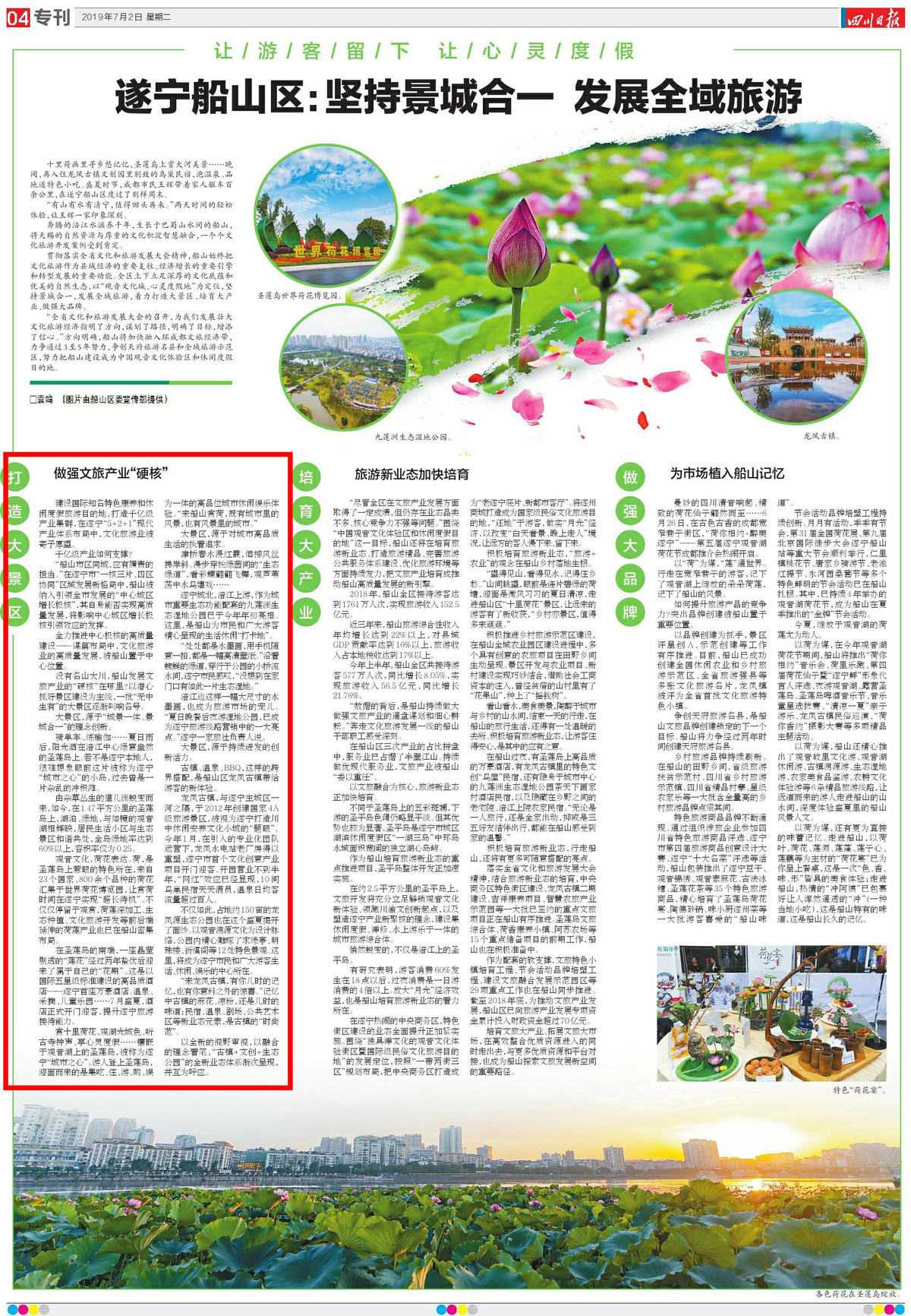 7月2日,《四川日报》推出专题报道,从景区建设、产业培育、品牌塑造等多个维度梳理船山区推进文旅产业发展的系统谋划,全方位介绍船山区文旅产业发展的探索与实践。