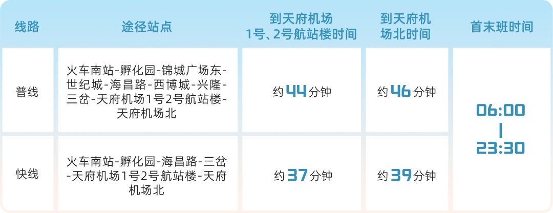 快线在早、中、晚共开通,其余时间为普线运行。火车南站、成都天府国际机场首末班时间相同。