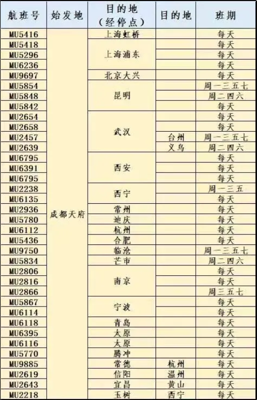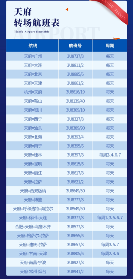 开通成都天府至北京(首都、大兴)、上海(虹桥、浦东)、广州、深圳、杭州、南京、厦门、武汉等商务干线