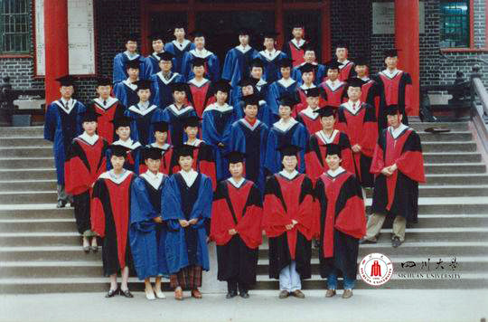 1999年毕业的硕士生和博士生的合影,他们的毕业证书上留下的就是四川联合大学的校名。