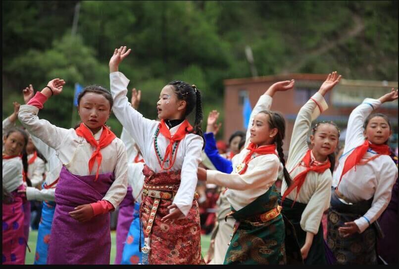 从2012年起,壤塘县把非遗文化送进校园。图为壤塘县寄宿制小学学生在跳藏族锅庄 徐中成摄