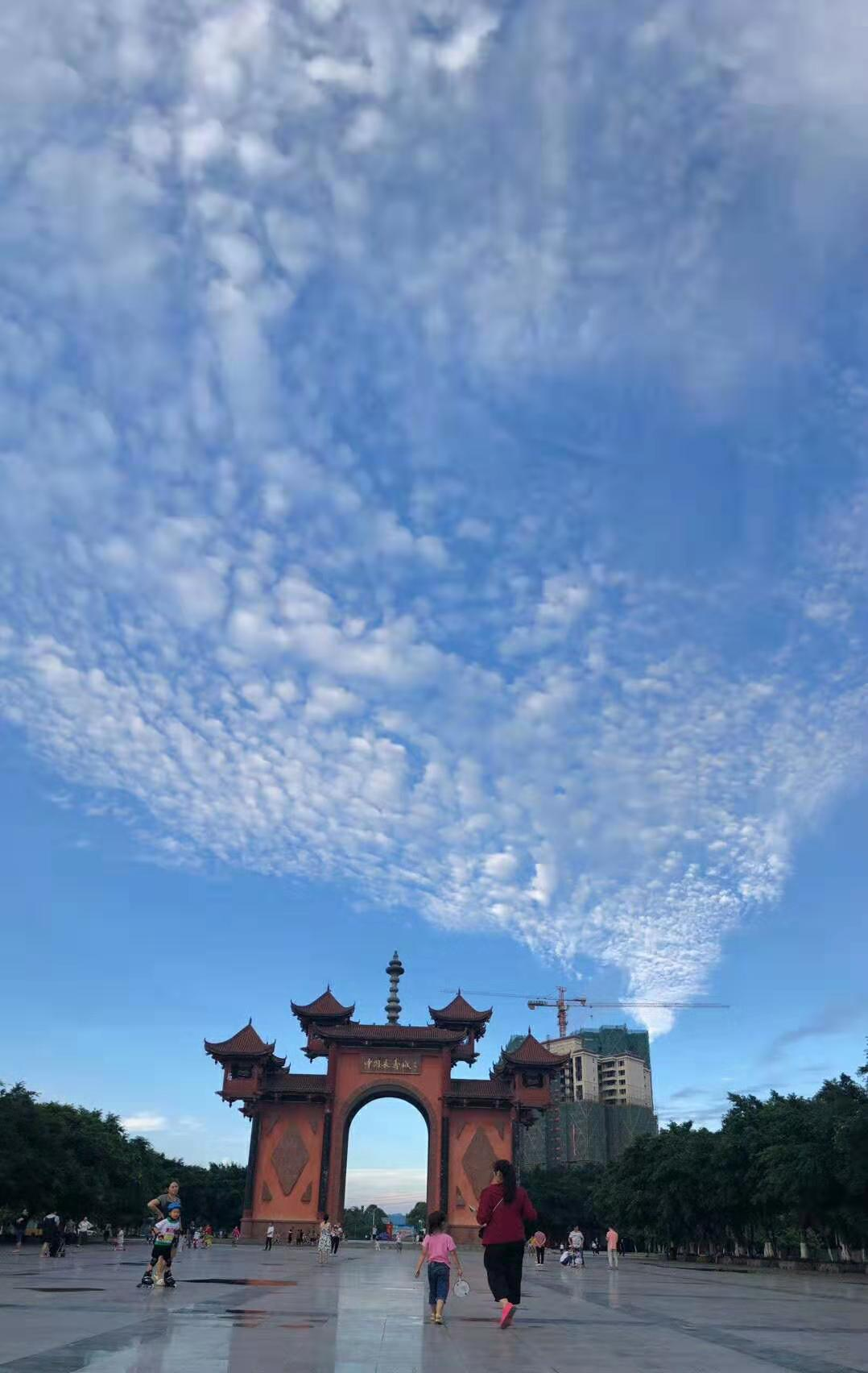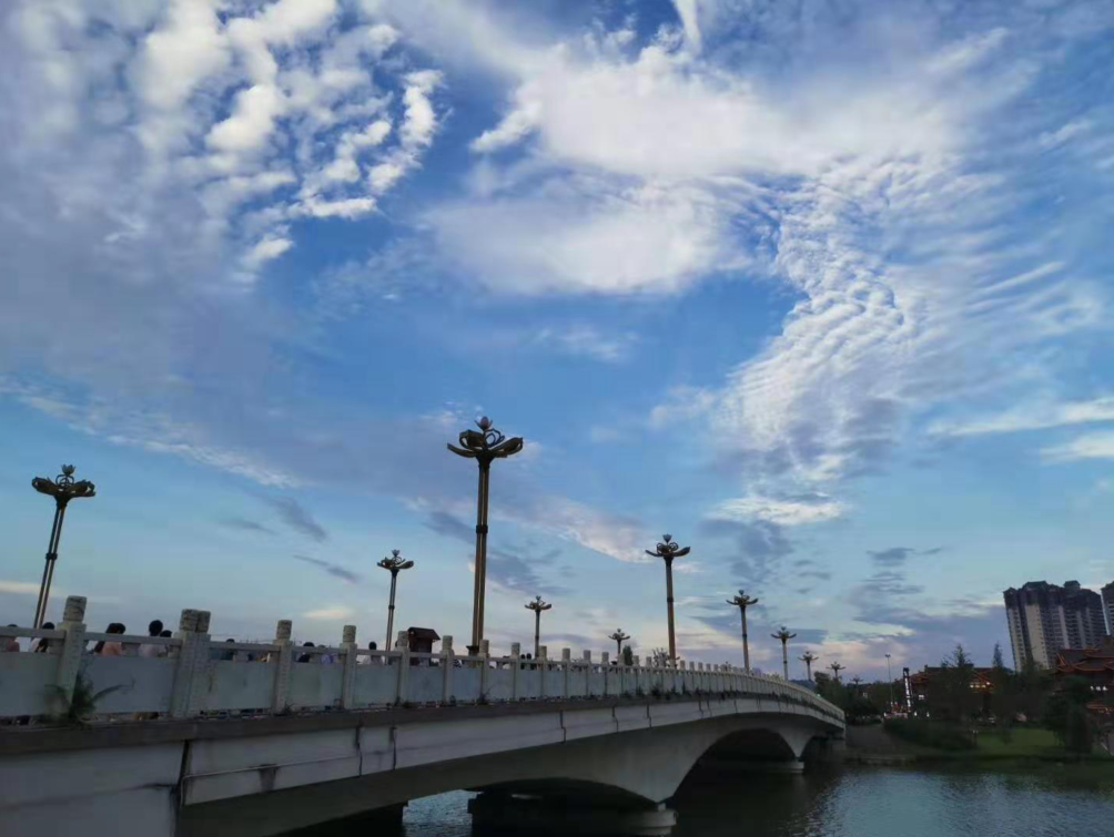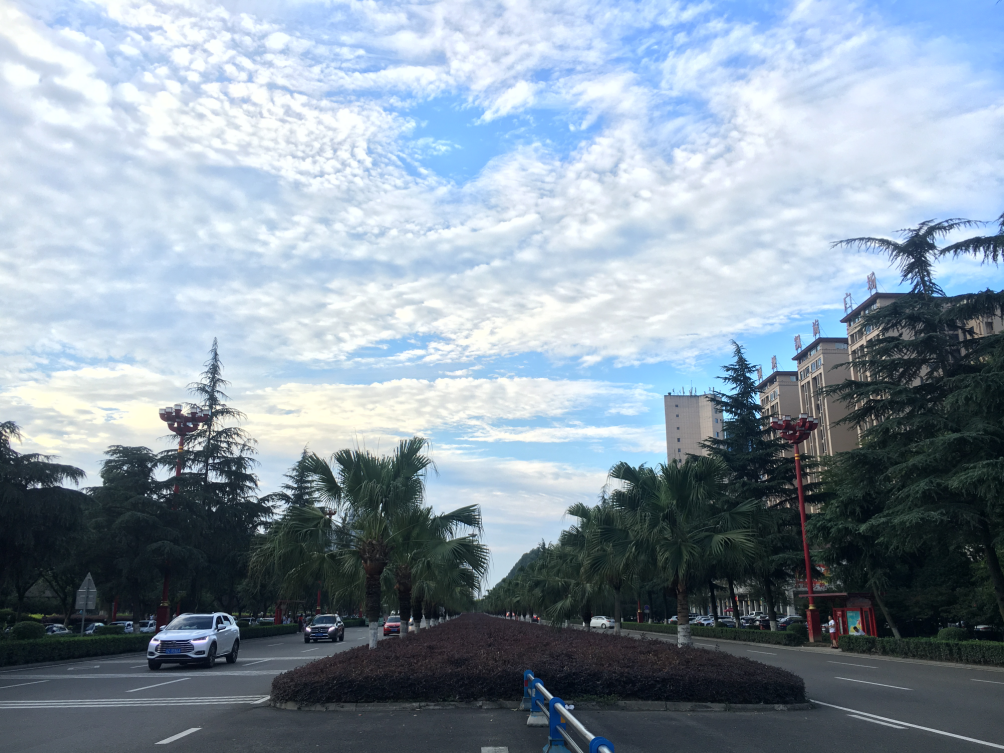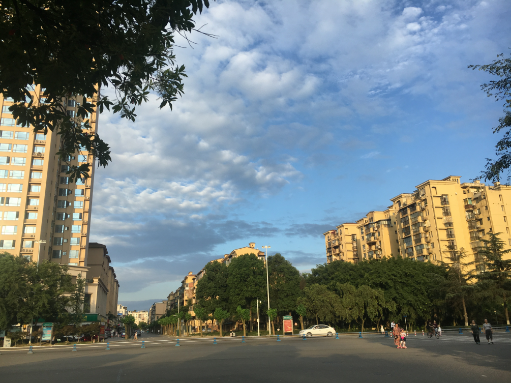 花宜带露观,云宜雨后看。昨日一上午的大雨后,眉山天空蓝得晶莹、澄澈,犹如一块蓝宝石,朵朵白云绵延其上,让天空多了一份诗意。