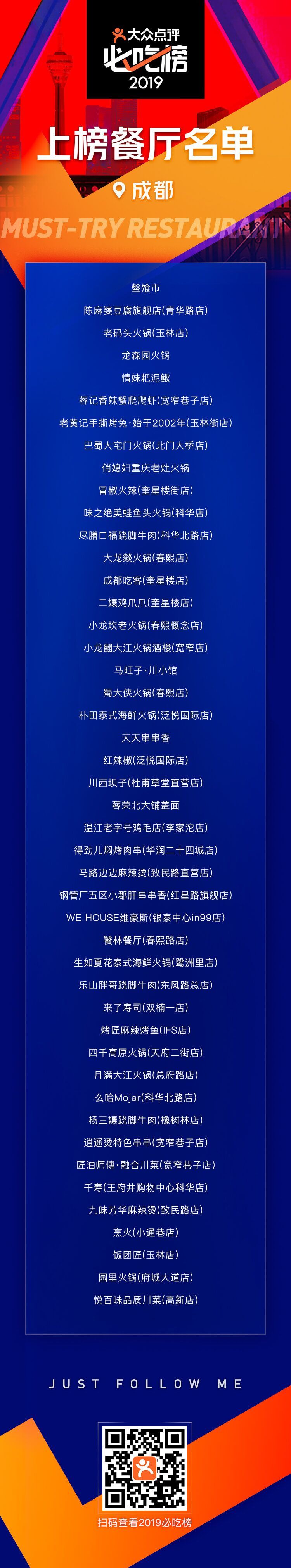 7月5日,2019大众点评必吃榜在广州正式发布,全国共有1463家必吃餐厅和655道必吃菜上榜。2019年,大众点评必吃榜从入围餐厅中最终评选出1463家必吃餐厅,其中从2017年起三年连续上榜的餐厅有47家。作为“美食之都”的成都,这次共有陈麻婆豆腐、冒椒火辣、大龙燚火锅等46家餐厅上榜,麻辣火锅、钟水饺、樟茶鸭、鱼香肉丝、兔头等31种菜品登上必吃菜榜单,宽窄巷子上榜必吃街。