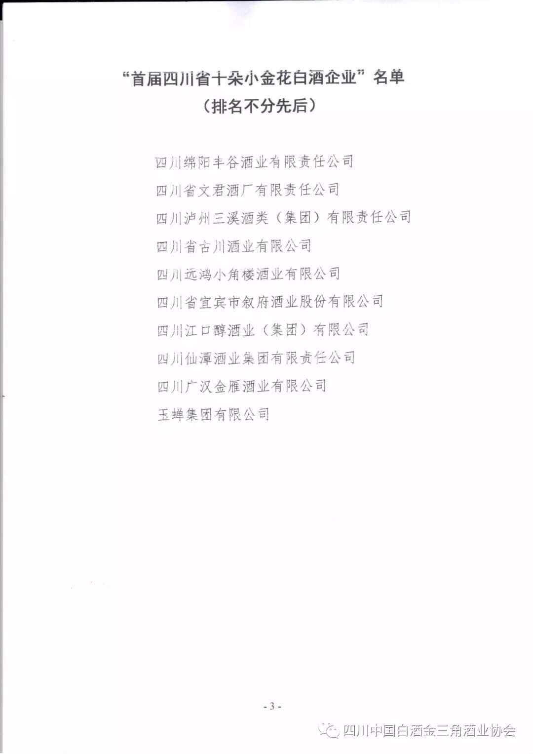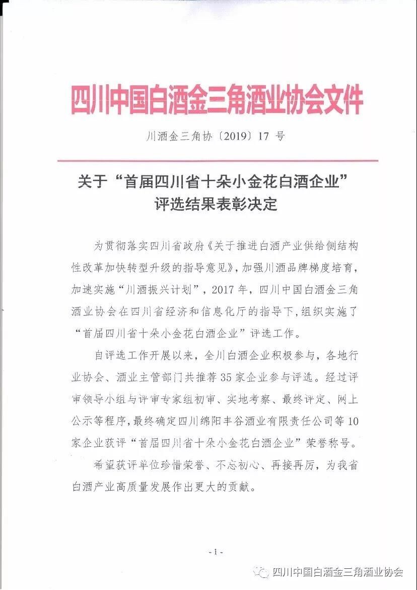 通过评审领导小组与评审专家初审、实地考察、最终评定、网上公示等程序,最终评选出:四川绵阳丰谷酒业有限责任公司、四川省文君酒厂有限责任公司、四川泸州三溪酒类(集团)有限责任公司、四川省古川酒业有限公司、四川远鸿小角楼酒业有限公司、四川省宜宾市叙府酒业股份有限公司、四川江口醇酒业(集团)有限公司、四川仙潭酒业集团有限责任公司、四川广汉金雁酒业有限公司、玉蝉集团有限公司等10家企业,成为“首届四川省十朵小金花白酒企业”。