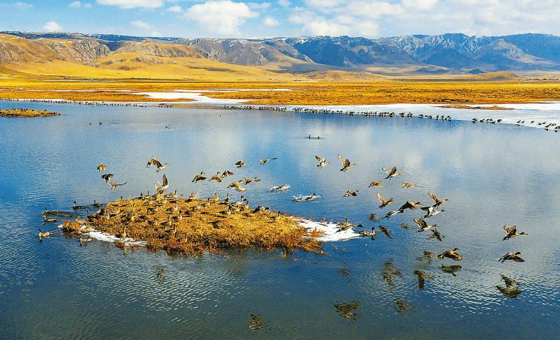 初春的若尔盖花湖上,数千只候鸟嬉戏翱翔。记者 尹钢 摄