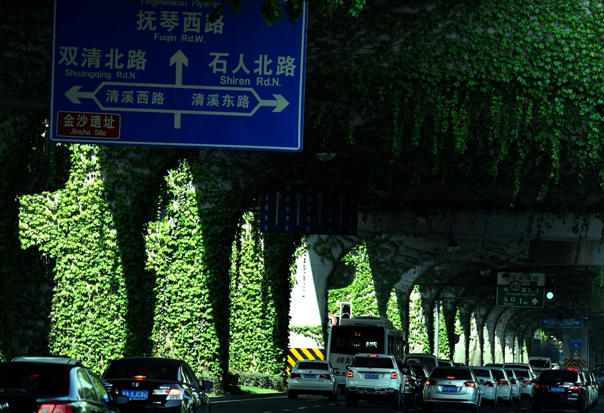 成都二环路高架桥桥墩被爬山虎覆盖。记者 李向雨 摄