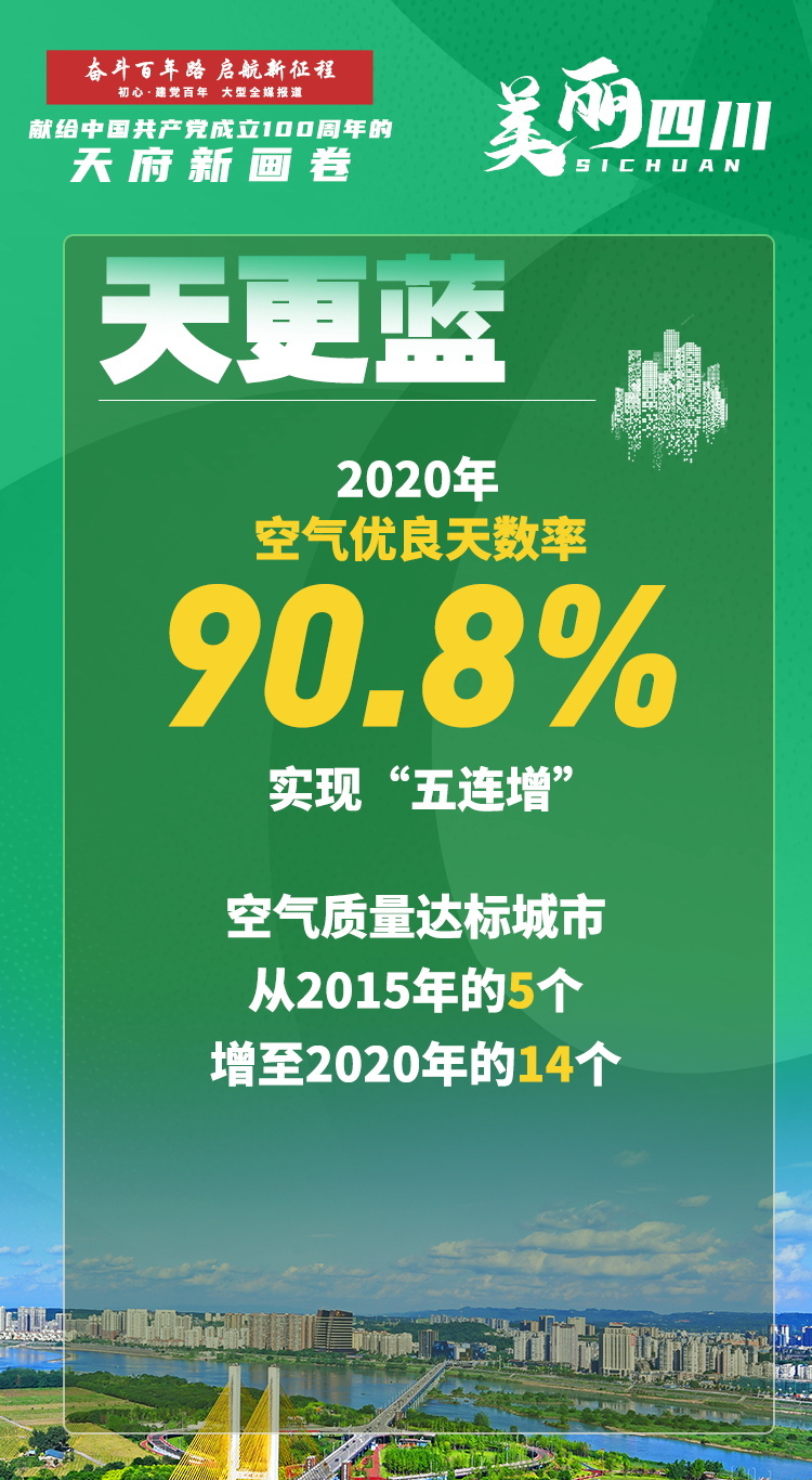 天更蓝了。2020年,全省空气优良天数率达90.8%,较2015年提高5.6个百分点,超额完成“十三五”目标任务。全省21个市州中,空气达标城市已达14个,较2015年增加9个。