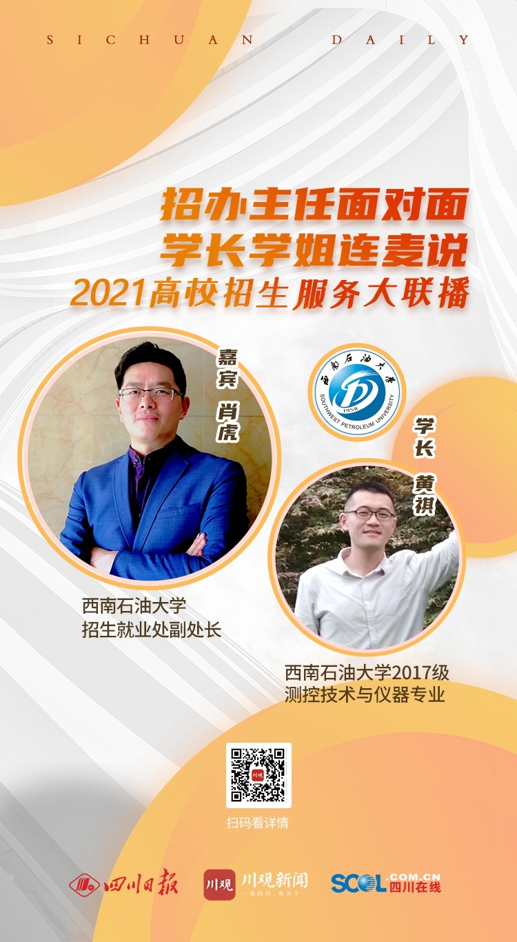 6月23日,由四川日报全媒体重磅推出的“招办主任面对面 学长学姐连麦说”2021高校招生服务大联播第一场开启。西南石油大学招就处副处长肖虎作为嘉宾做客直播间,为广大考生和家长解读西南石油大学今年的招生政策、优势专业,介绍填报志愿的技巧。西南石油大学2017级测控技术与仪器专业学生黄祺也通过连麦,给学弟学妹分享自己当初报考的情况和在学校就读的体会。