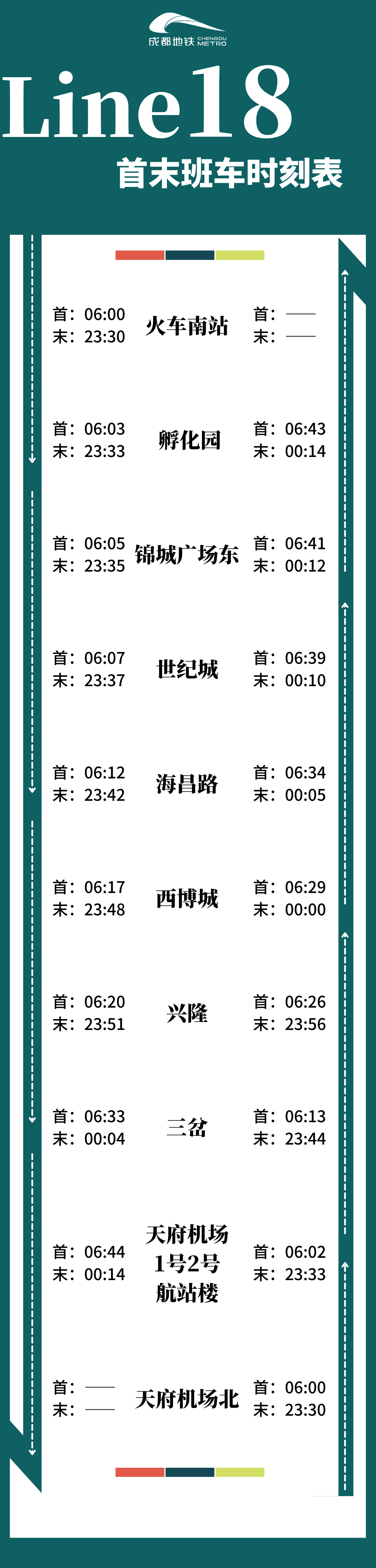 看时间。待天府机场1号2号航站楼站投用后,18号线两端始发站火车南站、天府机场北站的首班车时间均调整为06:00,末班车时间均调整为23:30,届时轨道交通18号线运营服务时长将跻身全国城市地铁机场线前列。